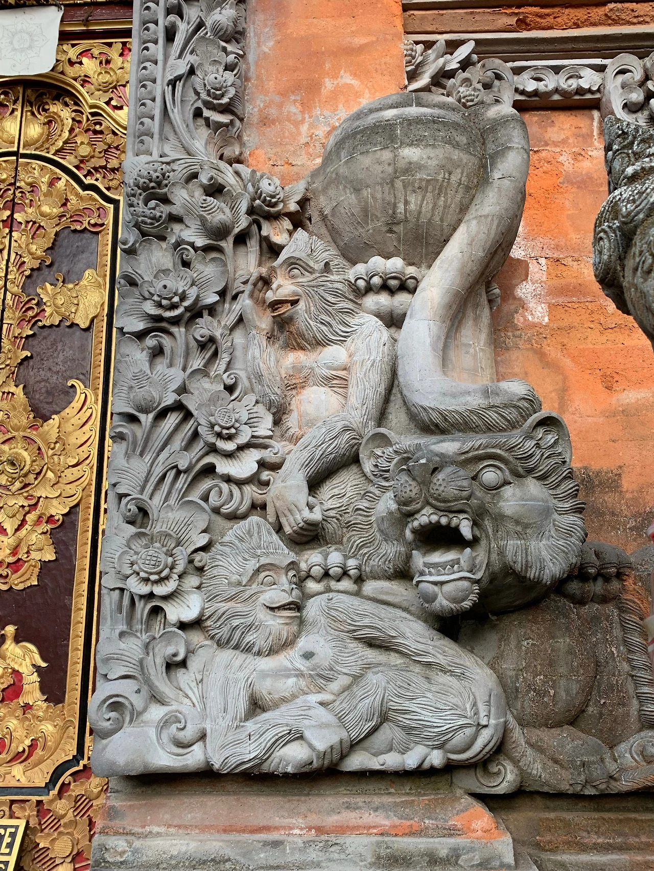 여전히 왕족이 살고 있는 곳임에도 귀족적 뽐냄 없이 소박하고 입장료도 없다. 엄격한 종교적 건축 방식을 따랐음에도 사원처럼 경직된 느낌이 없고, 발랄한 색채들이 사람 냄새를 풍긴다. 여기도 사람 사는 집이네. 마음에 든다. 반얀트리를 둥그렇게 둘러싼 벤치에 앉는다. 드와라팔라 석상과 혀를 길게 뺀 여마왕 랑다Rangda 조각, 덩굴 식물과 원숭이를 새긴 부조들이 엉켜 신비로운 분위기를 풍기고 건축에 생기를 불어넣는다. 니콜라스는 원숭이와 신들이 함께 새겨진 모습이 궁금하다. “힌두교에선 원숭이 신도 믿거든.” 원숭이 장군 하누만Hanuman 이야기를 해 준다. 흥미로운 다신의 세계. 해가 지자 중문을 주변으로 레드 카펫을 깐다. 전통 공연이 시작된다며. “볼까?” 기다리다가 입장료가 있단 말에 고민하다 길을 나선다. “밥 먹으러 가자.”