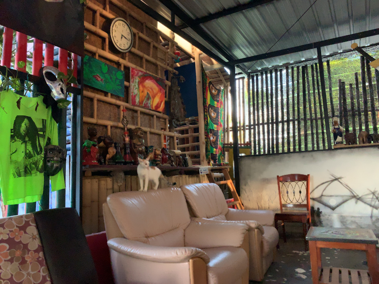 푸껫의 도로는 주로 해안선을 따라 나 있다. 특히나 이름난 비치가 몰려 있는 중서~남서쪽 해안가 중심으로. 동쪽 구시가에서 일몰로 유명하다는 최남단 프롬텝Promtep 곶까지는 30분이 채 안 걸린다. 도로엔 야마하의 대형 스쿠터인 티맥스T-MAX가 여러 대 달린다. 다들 뒤에 여자 친구를 태운 걸 보니 이 동네 멋쟁이들에겐 티맥스가 유행인가 보다. 여행을 시작하고 대형 스쿠터를 처음 본 니콜라스는 곧 큰 모터바이크(500cc 이상)도 볼 수 있을 거라며 희망을 가진다. 신이 한가득 난 그는 125cc짜리 형광 노랑 스쿠터 주제에 티맥스를 따라잡으려 안달이다. 고개 넘어 도착한 숙소 이름은 야누이 하이드어웨이Yanui Hideaway. ‘은신처’란 이름답게 산속 한적한 곳, 소가 뛰노는 풀밭 옆 옥빛 하늘빛 덧칠한 나무집에는 오후 4시 전엔 전기도 와이파이도 없다. 오랜만에 인터넷 없는 한가로운 시간들을 보낸다.