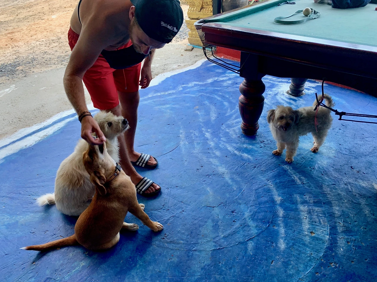 프롬텝 곶 근처의 허름한 펍으로 들어선다. 얼기설기 들여놓은 중고 소파와 당구대, 칠하다 만 인테리어가 이채롭다. 동네 고양이들과 애교 많은 강아지들, 꼭꼭꼭꼬 우는 수탉까지 거두는 요상한 펍. 안에는 폴란드 인 할아버지가 그림을 그리고 있다. 처음에는 조그맣게 술만 팔다가 이제는 레스토랑 오픈 준비를 하고 있단다. 호주로 이민 왔다가 잠시 들린 푸껫에 반해 눌러앉게 된 사장님은 그렇게 7년이 흘렀다며, 이렇게 하고픈 대로 그림을 그리며 사는 삶이 자유롭고 좋다고 한다. 사장님은 우리를 좋게 보셨는지, 배고픈 우리를 위해 자기 단골집 메뉴판을 가져다주고 스쿠터로 음식을 픽업해 오는 수고도 마다하지 않으신다. 덕분에 한 병이 될 맥주는 두 병이 되고. 강아지들과 한참을 놀다 보니 일몰 시간이 가까워진다. 일어서는 우리에게 사장님이 조금만 기다려 달라기에 이상히 여겼는데, 글쎄 잠시 후 우리 손에 물고기 두 마리가 그려진 돌멩이를 꼭 쥐어주시는 것 아닌가. 우리에게서 사이좋은 물고기 한 쌍의 모습을 보았단다. 완성이 덜 됐지만 예쁘게 봐 달라며.
