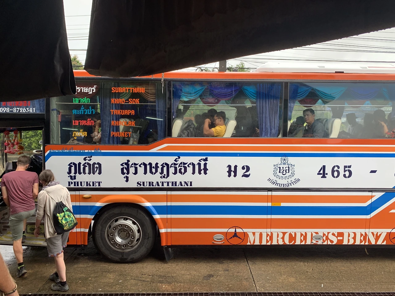 메르세데스-벤츠를 대문짝만 하게 새겨 놓은 버스는 나름대로 쾌적했다. 검표하는 청년은 “수랏타니요.”하는 우리에게 은빛 원통에서 가격만큼 돌돌 뽑아 위생 랩처럼 챡, 하고 종이 표를 끊어 주었다. 20밧짜리 표 5장, 10밧짜리 표 5장이니 1인당 150밧이었다. 좌석을 한껏 젖히고 누웠다. 비는 계속해서 내렸다. 카오락을 벗어날수록 물에 잠긴 도로가 많아졌고 버스는 물살을 크게 갈랐다. 출발한 지 한 시간도 채 안 되어 타쿠아 파Takua Pa에 섰다. 푸껫에서 출발한 승객들을 감안하면 3시간, 휴게소에 들를 시간이었다. 화장실은 한 턱 높인 지대에 칸마다 화변기가 있는 90년대 시외버스 정류장의 것 같았다. 서양인 여성과 나는 멋쩍게 화장실을 썼다. 타쿠아 파는 카오락의 북쪽 끝 쓰나미 메모리얼 파크가 있는 동네다. 카오락 쓰나미를 다룬 영화 <더 임파서블>에 나온 실제 병원도 여기 있다. 여러 갈래의 커다란 강이 바다와 만나는 곳. 그래서인지 곳곳 도랑과 도로가 더 많이 잠겨 있었다.