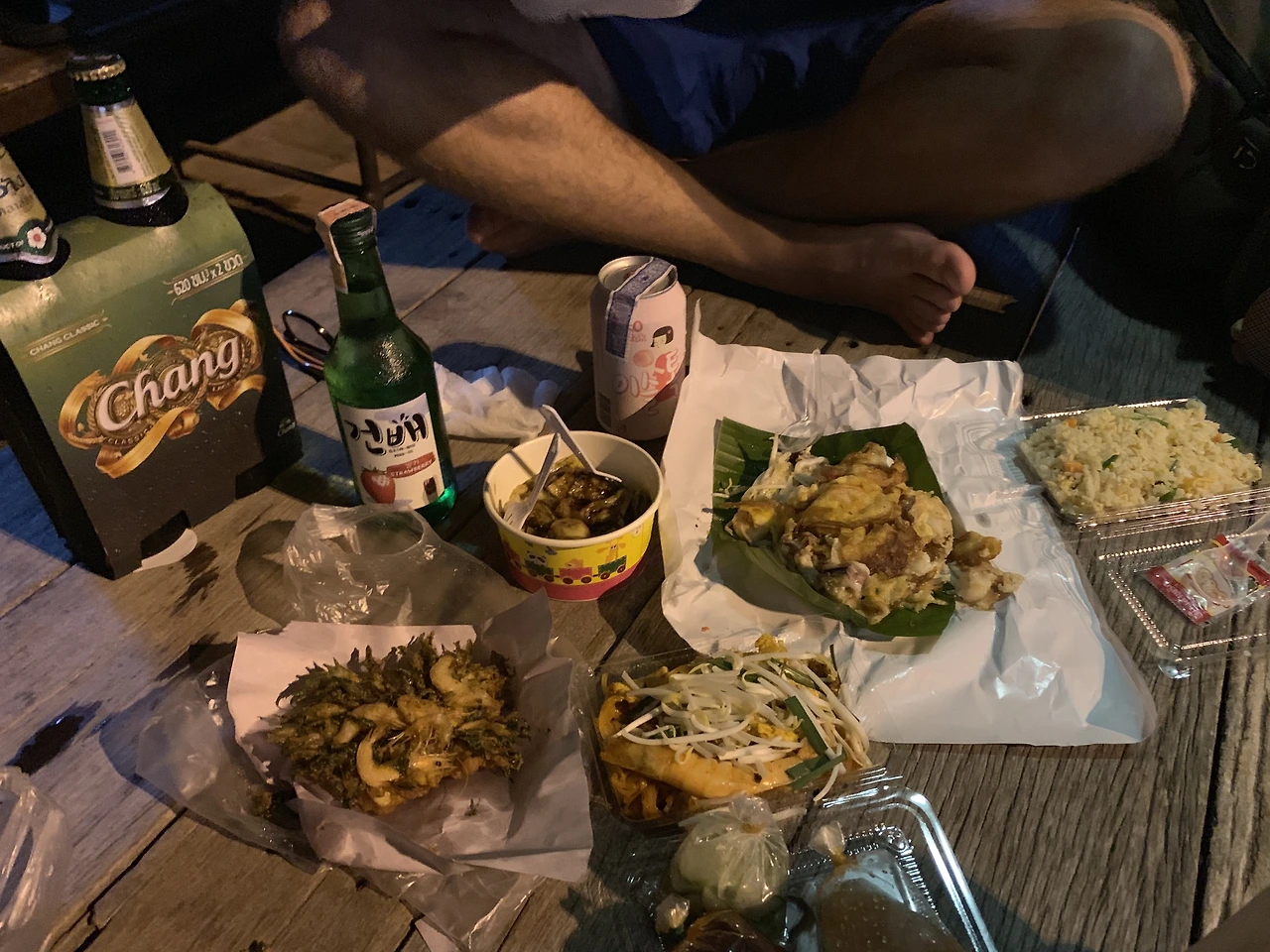 시장으로 가 길거리 음식을 샀다. 10밧짜리 고소한 건새우튀김, 해산물에 밀가루와 계란물을 묻혀 부쳐주는 전, 한 쟁반 만들어 놓고 그 자리에서 덜어 파는 팟타이와 팟씨유. 기름 팬에 찰진 반죽을 부쳐 누텔라를 슥슥 발라 말아주는 태국식 팬케이크 로띠까지. 다들 퇴근하고 들러서 주전부리를 사들고 가는 모양이었다. 음식을 만드는 이 사는 이 저마다 웃고 있었다. 실로 오랜만에 사람 사는 냄새가 났다. 우리도 이것저것 한아름 사 역 앞 평상에 앉았다. 세븐일레븐에 들러 태국 맥주 창Chang을 사는 것도 잊지 않았다.