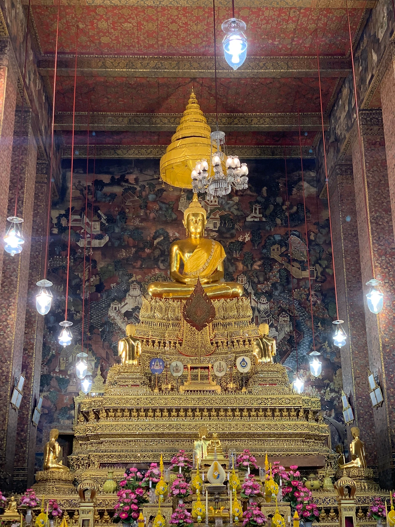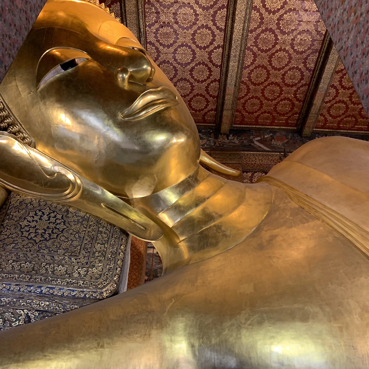 태국에서 가장 큰 46m짜리 와불상Reclining Buddha을 보러 가서도 나는 벽화가 뭘 이야기하는지, 문에 덧칠한 페인트들은 새로 보수한 건지, 들어선 샹들리에는 어떻게 매단 건지, 부처님 발에 장식된 자개들은 무슨 의미인지 궁금하고, 그는 이 거대한 불상을 감싸려 얼마나 많은 금이 들어갔을까, 과연 이 금은 진짜일까, 왜 부처님이 누워 있는 걸까, 부처를 먼저 만들고 건물을 지었을까, 건물을 짓고 부처를 조립한 걸까 재미난 상상을 한다.