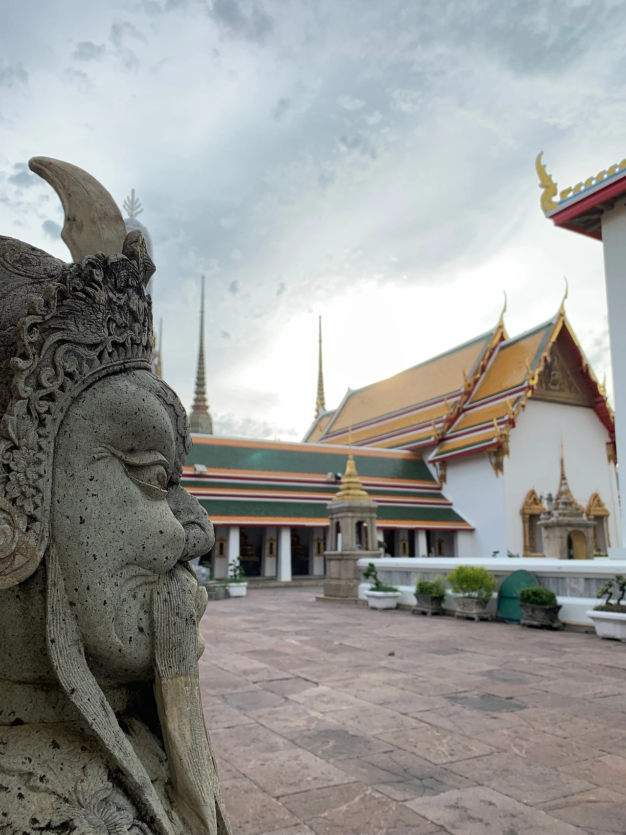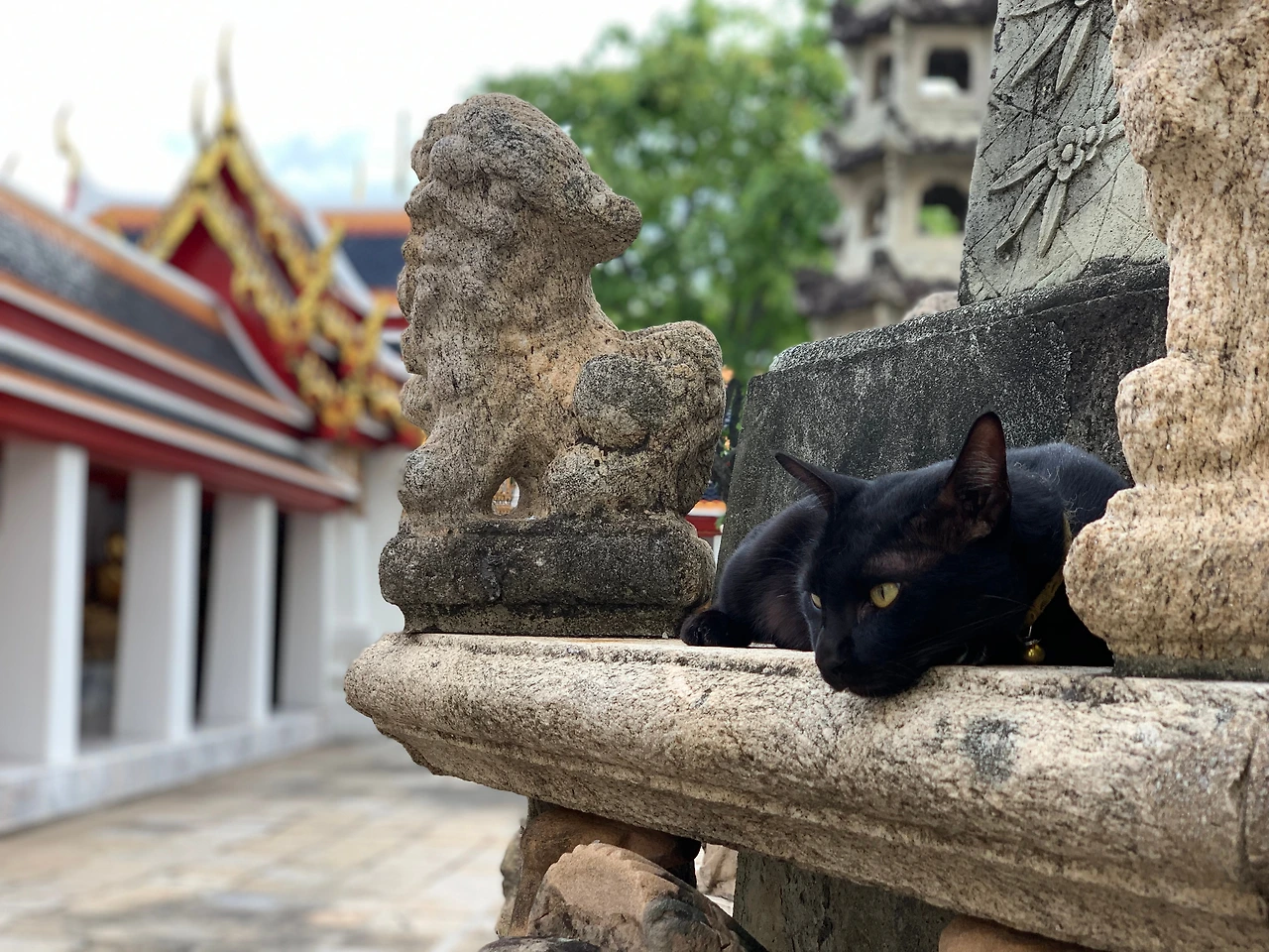 내가 처마를 바라볼 때 그는 사원을 지키는 중국식 석상을 찾아 자기 키와 대 본다. 뚱뚱하고 작아 보이는 석상이지만 가까이 가 보면 수호 석상답게 제법 몸집이 크다. 뜬금없이 왜 중국식 석상이 불교 사원을 지킬까? 옛날 옛적 태국과 무역하던 중국 상인들은 뱃머리의 선수상이나 배의 중심을 잡기 위해 배 바닥에 싣고 온 석상들을 종종 이곳에 남겨두고 갔다고 한다. 무언가를 지켜달란 믿음으로 만든 것이니, 배든 사원이든 의미는 어울린다. 니콜라스 덕에 알게 된 새로운 사실이다.