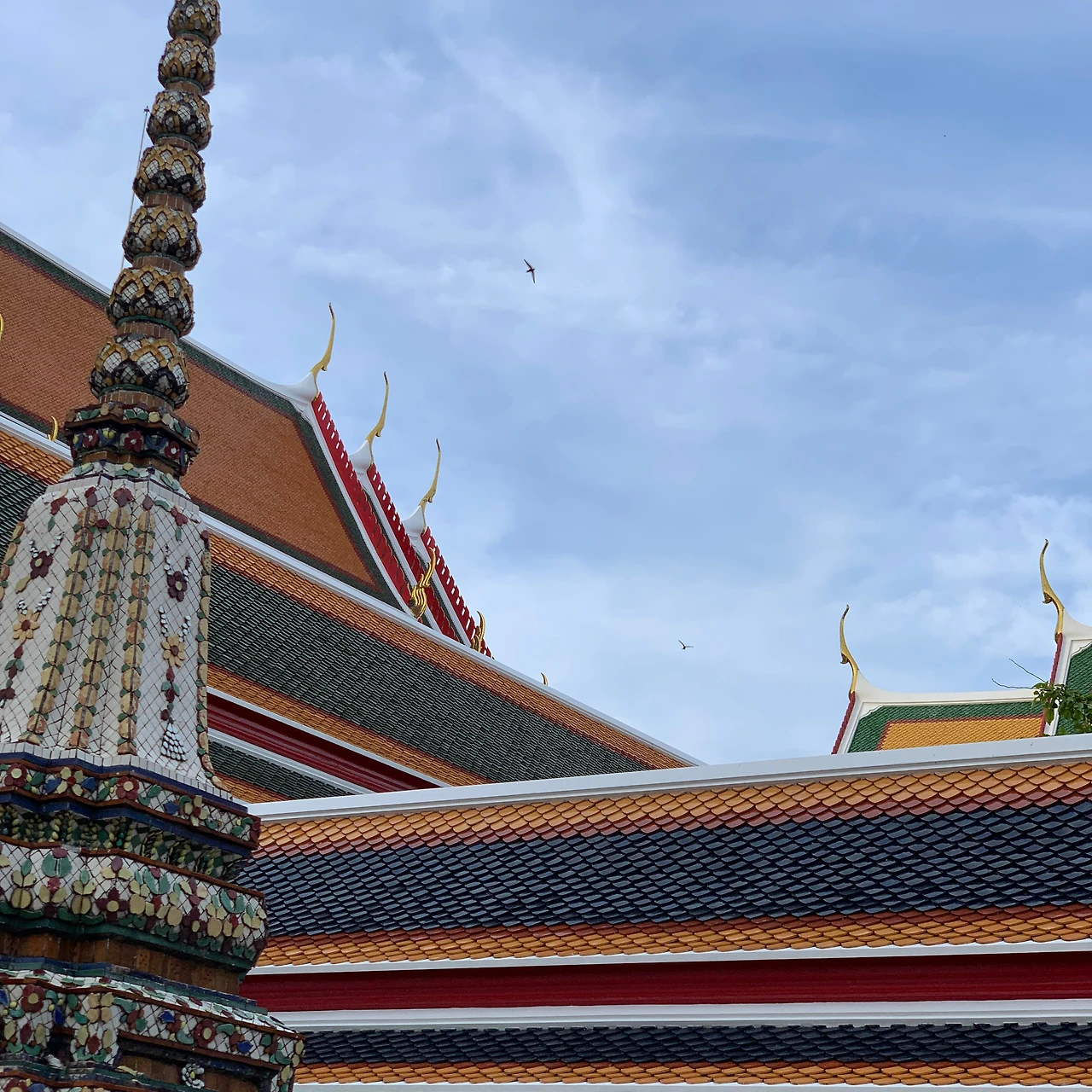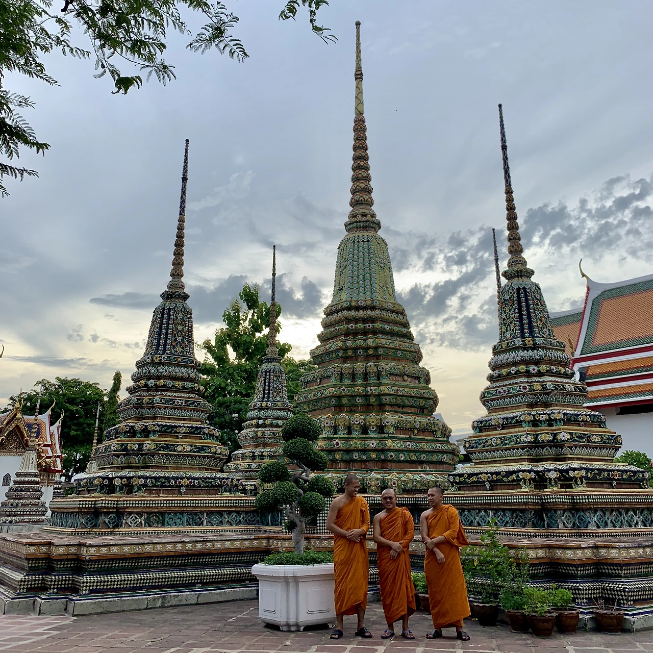 공원 맞은편에 왓 포가 보인다. 15분 걸린다는 길을 한 시간 반이 걸려 왔다. 1인당 200밧(약 7,600원)을 내고 입장한다. 우리나라 절의 흙바닥과 다르게 보도블록이 깔린 사원은 조금 건조한 느낌이다. 멀리서 보던 어둡고 오묘한 색감을 가까이에서 보고 놀란다. 거대한 지붕을 덮은 진주황(혹은 노랑), 빨강, 진초록의 이중 기와들과 크고 작은 석탑(쩨디)들의 미색, 진보라, 어두운 빨강과 에메랄드색, 푸른색, 진한 개나리색 도기 장식들. 주황 승려복을 두른 멋진 스님들.
