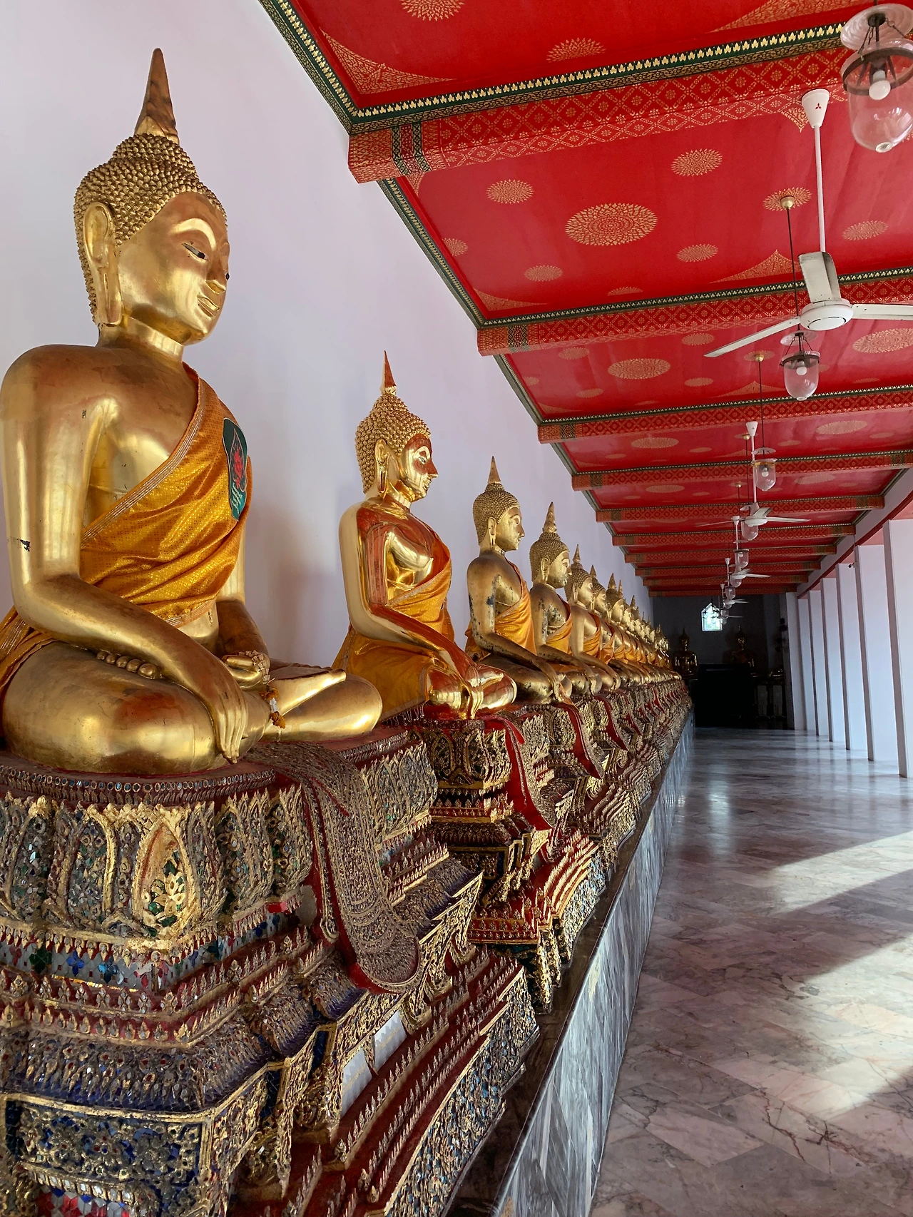 늦은 시간이라 그런지 사원 안은 한가하다. 희고 육중한 네모 기둥이 대법전 회랑에 긴 그림자를 드리운다. 늘어선 부처상들은 아유타야~수코타이 왕국(13~18C) 시대 절에 남겨진 유물을 라마 1세가 한데 모은 것이다. 황동에 금을 입힌 부처들이 은은하게 빛난다. 법전 앞 작은 석탑에 고양이가 앉아 쉬고 커다란 지붕 위로는 다람쥐가 뛰어다닌다. 대법전 안에는 커다란 금빛 부처님이 높이 앉아 신자들을 굽어본다. 니콜라스는 한껏 경건해진다. 동서를 막론하고 정교하고 숭고한 종교 작품은 누구든 엄숙하게 만드는 힘이 있다. 나는 부처님 뒤의 탱화와 기둥과 천장을 감싼 벽지를 본다. 기둥마다 왕조의 역사가 그려져 있다. 무릎 꿇고 오래 버티지도 못하는 니콜라스는 연신 몸을 배배 꼰다. 지는 해에 처마를 따라 두른 금빛 람용lamyong이 반짝반짝 빛난다. 우리는 손을 잡고 문을 나선다. 멀리 불어오는 강바람이 느껴진다. 너무 즐거운 시간이었어. 우리, 강변을 걷자.