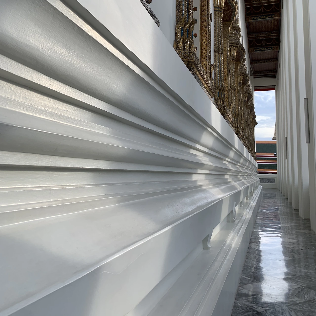 하늘을 찌를 듯 뾰족이 오른 수십 쩨디의 고고한 직선과 지붕의 무거운 수평이 기하학적 미를 이루고 이 모든 색과 형태가 두꺼운 흰 기둥과 벽에 부딪혀 오히려 미래적인 느낌을 준다. 문마다 장식된 금세공과 추녀 끝에서 하늘로 구부려 올린 금색 초파Chofah들이 그래도 이 건물은 고적古跡이라고 말하고 있다. 초파는 반인 반조 신 가루다Garuda의 날개에서 비롯한 것인데, 흔히 알고 있듯 힌두의 비슈누Vishnu가 타고 다니던 새다. 불교에서도 신성한 동물로 추앙받으며 태국의 국장國章이기도 하다.