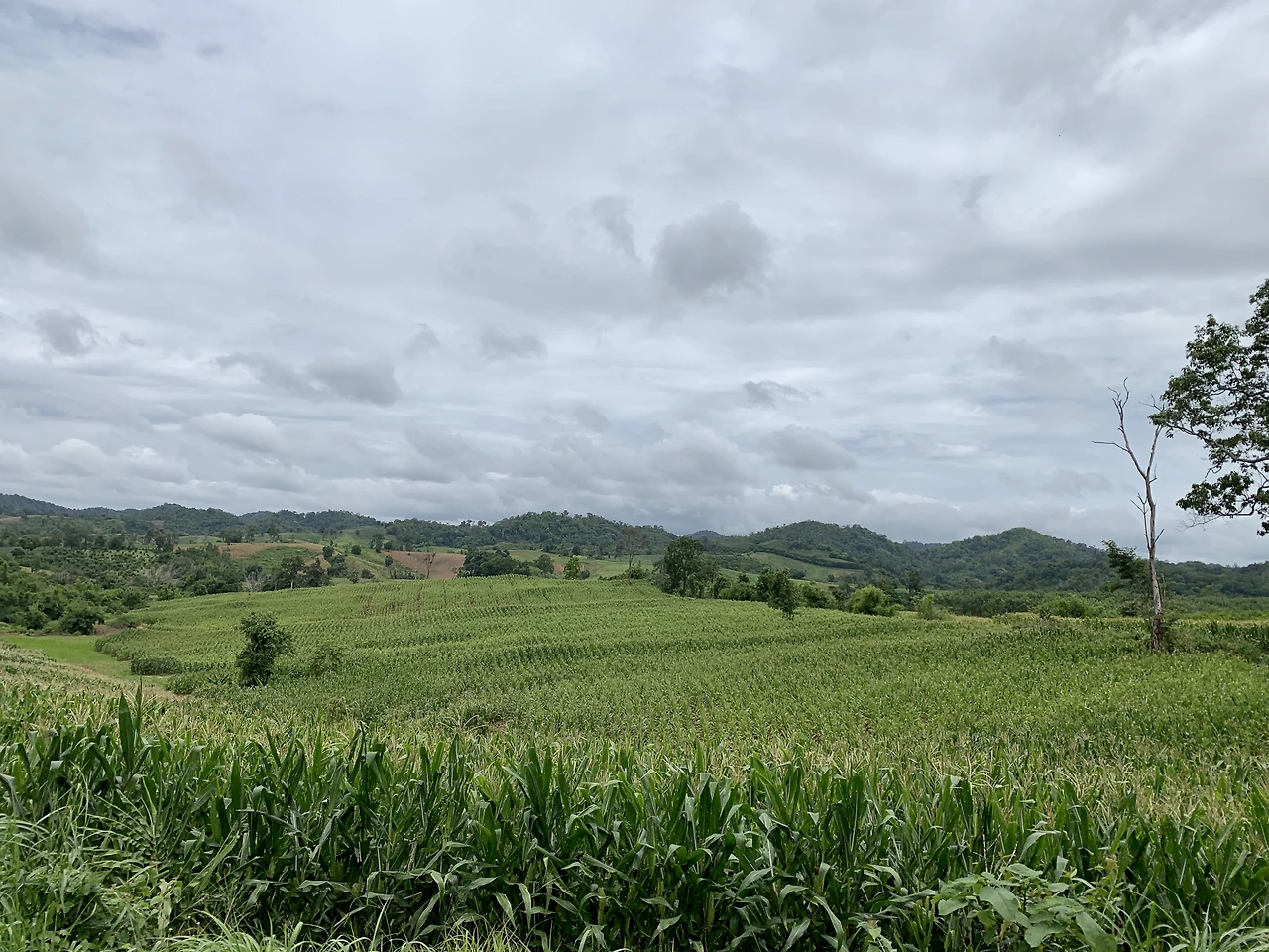펫차분에서 롬싹 사거리로 직진한 뒤 12번 도로로 우회전하면(어제 사원 갔던 길과 반대) 남나오 국립공원 초입에 바로 닿을 수 있지만, 즉 40분 만에 가겠지만, 굳이 숙소 앞에서 우회전을 해 국립공원 곁길을 따라 올라가 본다. 40분 받고 30분 더. 옆으로 과수원과 밭, 고무나무 농장이 펼쳐지다 산이 가까워지며 덩달아 언덕도 많아진다. 도로가 오르막 내리막을 옅게 반복한다. 물의 얕은 파동처럼, 작은 놀이기구를 타는 것처럼. 어제의 우회전 좌회선 롤러코스터와 또 다른 재미다.