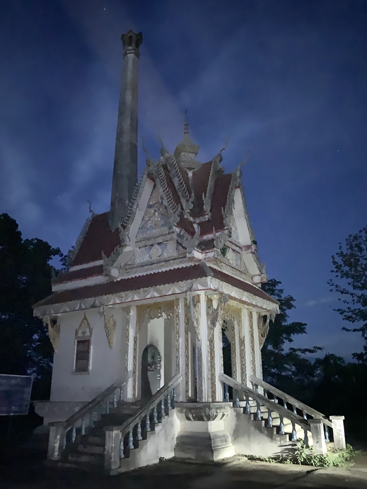 니콜라스가 호수를 기억했던 것처럼, 나도 떠오르는 곳이 있다. 묘한 분위기를 내던 전통 양식의 자그만 건물. 언뜻 지나친 바람에 어디에 있는지 모른다. 일대 여기저기를 더듬는다. “찾았다!” 논 주변 어둠 속에 홀로 서 있는 건물. 옆 공터에 모터바이크를 댄다. 무슨 건물일까, 왜 이런 곳에 혼자 남겨져 있을까? 궁금증을 참지 못하고 달려가는 나를 위해, 니콜라스가 헤드라이트로 건물을 비춰준다. 이토록 작은 건물 사이즈, 입구를 향해 난 세 방향의 계단, 아치형 철문, 높게 뻗은 굴뚝까지. 이제껏 한 번도 보지 못한 스타일임에도, 건물은 이 땅의 오랜 일부인 양 풍경과 너무나 자연스럽게 어울려 있다. 천천히 다가간다. 철문 가까이로 그을음이 묻어 있다. 화장장이었다. 오로지 한 구만을 위한 작은 공간. 이 지역 사람들은 이렇게 화장을 하는구나. 아이러니하게 나는 이 곳에서야 사람 냄새를 느낀다. 백색 사원의 반짝임보다, 금색 시계탑보다, 아편을 극복해낸 태국의 역사보다, 광대한 메콩강도 주지 못했던 감동을 이 작디작은 화장장이 조용하게 전한다. 털털털털, 시동을 끄지 않은 모터바이크 소리. 모터의 규칙적인 움직임에 따라 불빛이 흔들린다. 어깨동무를 한 그에게 기대 오래도록 화장장을 바라본다.