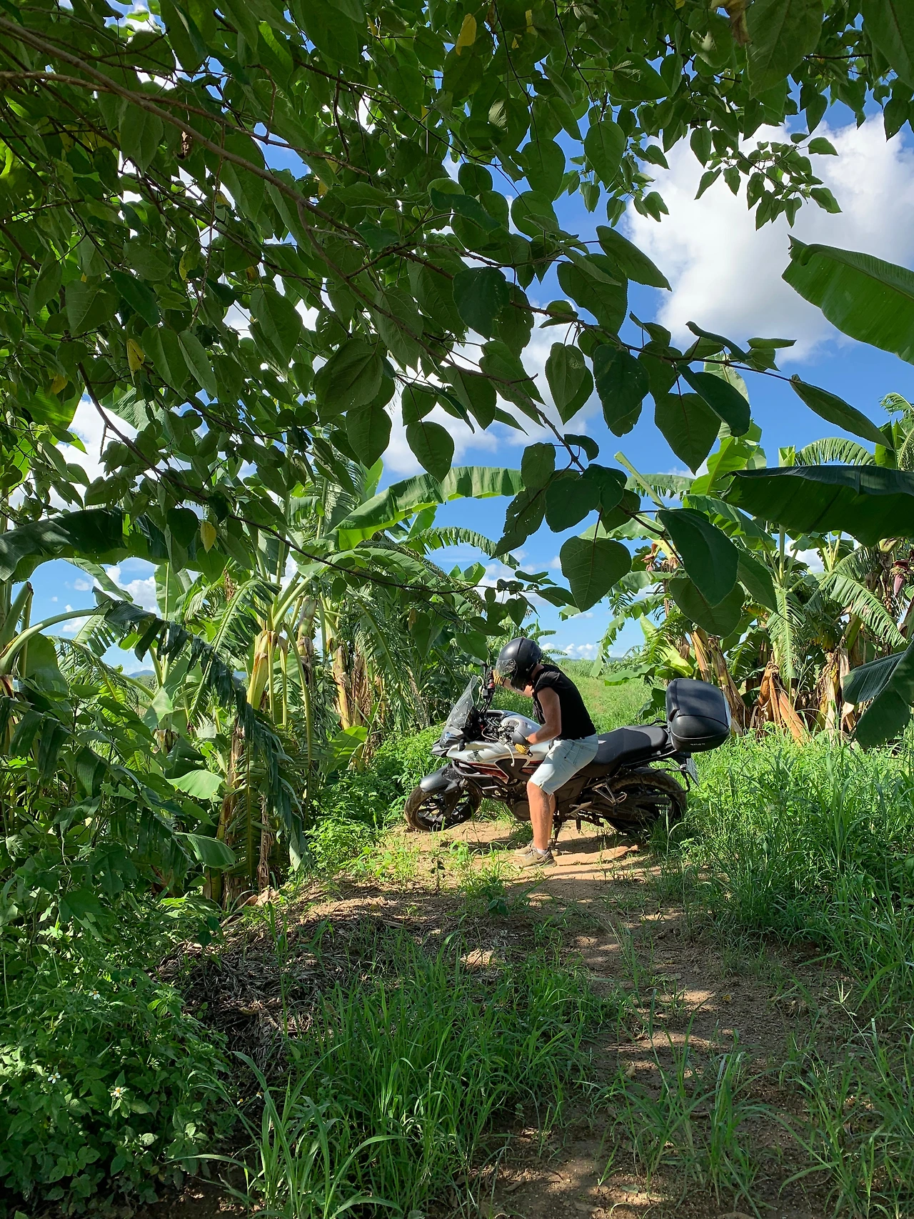 농촌 도로를 벗어나 좁은 논두렁 길로 들어선다. 덜컹덜컹, 오랜만에 맛보는 무심한 길이다. 옆으론 꽃핀 옥수수밭이 너르다. 길에는 풀이 무성하지만, 차가 지나간 흔적이 어렴풋이 남아 있어 안심한다. 어느 순간 오른쪽으로 강이 나타난다. 낮게 흐르는 강과 건너편의 푸른 초지들. 날씨마저 쾌청해 모험 기분을 더욱 빛내준다. 앱이 유턴하라는 말에도 아랑곳 않는다. 이렇게 버젓이 도로가 있는데 뭘! 그런데 점점 풀이 우거지더니 멀리 길이 보이지 않을 정도가 된다. 발밑이 보이지 않으니 가늠하기 어렵다. 니콜라스의 운전도 덩달아 어려워진다. 결국 내가 내린 다음 그 혼자 조금 더 가서 살펴보기로 한다. 멀리 바나나 나무 사이에 서서 고민하던 그는 좁은 흙길에서 혼자 끙끙대며 모터바이크를 돌린다. 길이 끊겼단다. 오던 길을 돌아간다. 좋지 않은 길에 모터바이크까지 무거워 운전이 까다롭다. 갑자기 니콜라스가 일어서서 운전한다. 균형을 잡는 데 훨씬 도움이 된다고 한다. 괜히 내가 오기를 부려 여기까지 온 것이 미안하다. 일어선 그, 흔들리는 모터바이크, 새파란 하늘, 우거진 풀과 나무들. 이 순간을 동영상으로 남긴다. 다시 흙길이 잘 보일 때쯤 오른쪽의 또 다른 논둑을 발견한다. 길 너비와 상태를 봐선 갈 수 있을 것 같다. 니콜라스가 묻는다. “이쪽으로 가 보지 않을래?”