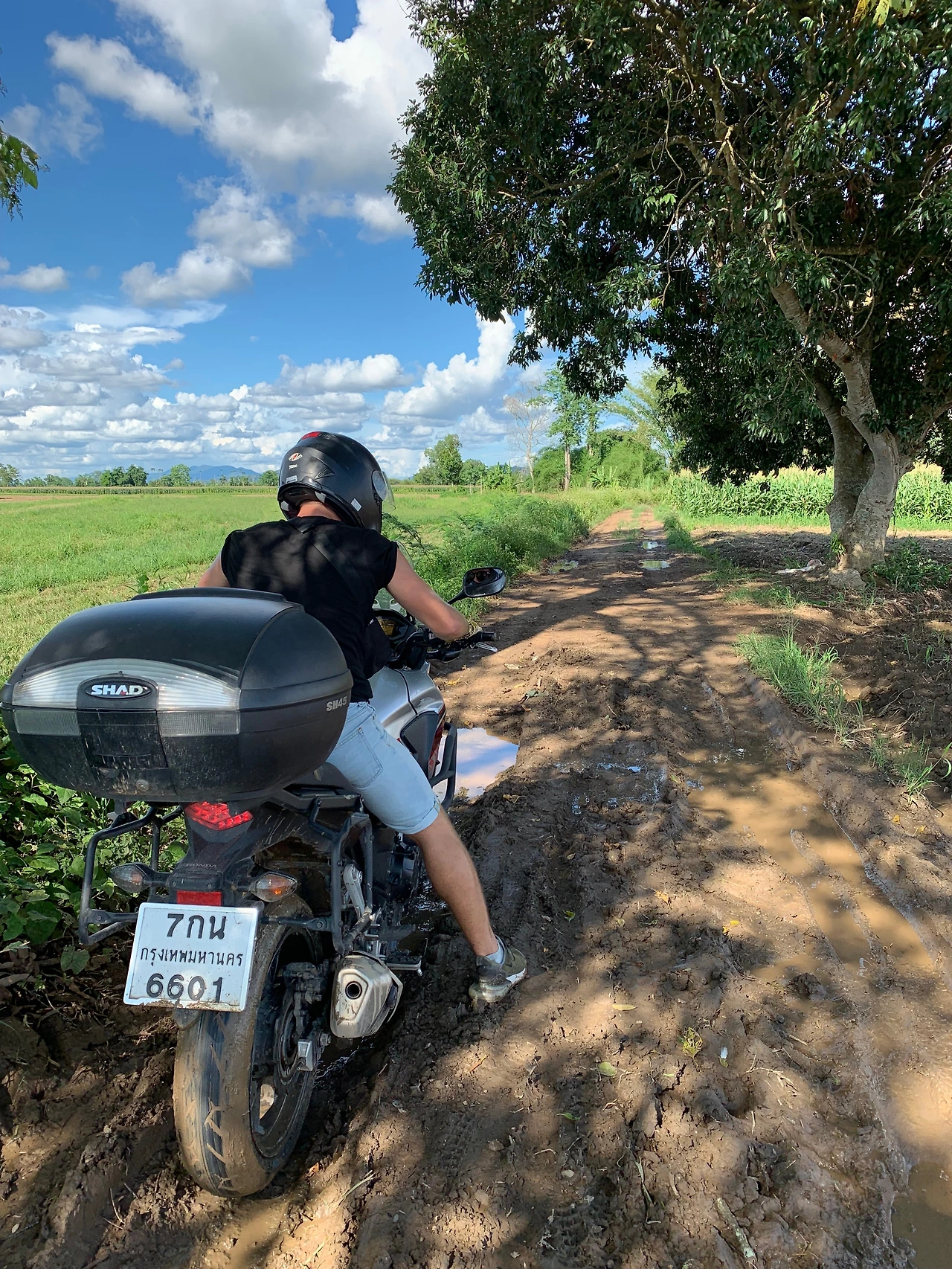 돌아가는 것보다 다시 한번 모험하길 택한다. 그러나 복병이 우릴 기다리고 있었다. 웅덩이였다. 얼마 전 비가 왔는지 자동차 바퀴 자국에 크고 작은 웅덩이가 생겨 있다. 흙은 질지만 그래도 시야가 트여 있어 괜찮을 거라 짐작한다. 그러나 갈수록 웅덩이들이 더 커지고, 종국에는 니콜라스가 양 발을 진흙탕에 다 빠뜨리고서야 겨우 균형을 유지할 정도가 된다. 운전이 아니라 두 발로 걸어간다는 게 맞을 만큼. 진흙 때문에 바퀴가 헛돈다. 아아. 여기도 아니구나... 내가 내린 뒤 니콜라스는 또다시 낑낑대며 바이크를 돌린다. 나는 다시 타지 않고 따라간다. 또 다른 웅덩이를 건너려던 니콜라스가 몇 번을 휘청거린다. 나는 이 모습도 추억이다 싶어 동영상을 찍는다.