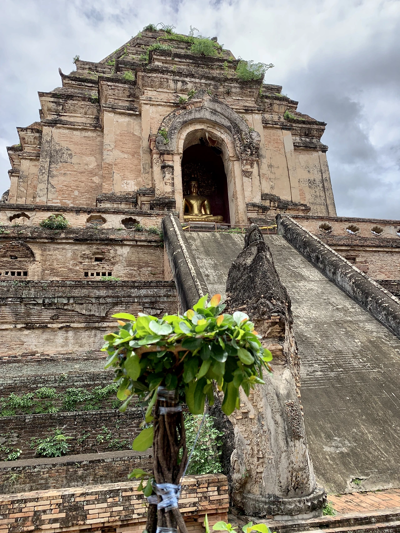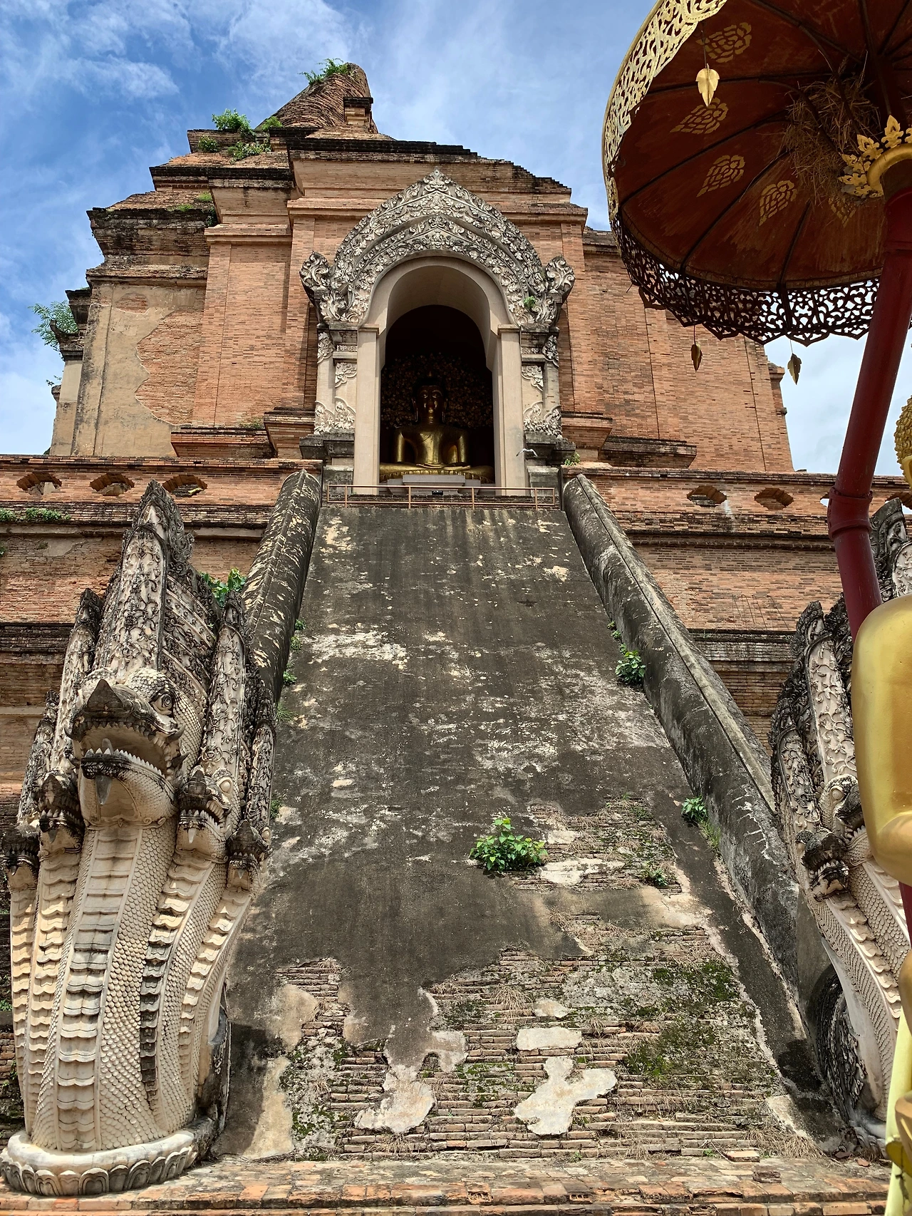 밖으로 나와 법당 뒤로 간다. 거대한 체디와 그 너른 공간에 기분이 탁 트인다. 좁은 골목길이 얽힌 치앙마이 구시가에서 이런 공간을 만나기는 쉽지 않다. 아유타야에서 본 왓 프라 람의 탑은 높지만 가녀려서 위태한 느낌이 들었는데, 이 체디는 지름부터 54m, 그 육중함이 다르다. 커다란 기단만 세 단으로 10m는 족히 되도록 쌓은 높이에 입구를 만들었다. 동서남북으로 입구가 네 개, 그곳까지 오르는 가파른 계단. 커다란 용이 계단 앞을 지키고 코끼리 상이 기단을 장식한다. 입구 안에는 금부처님이 앉아 있다.