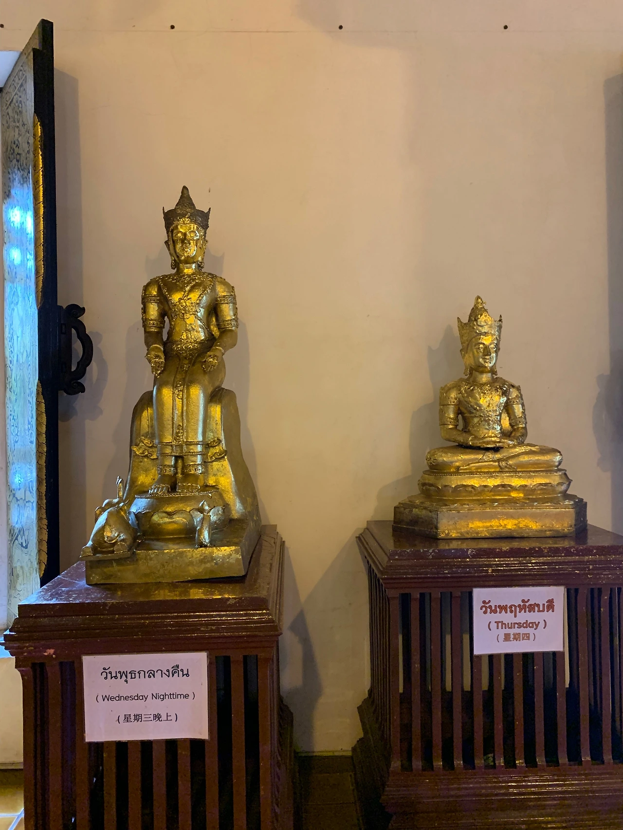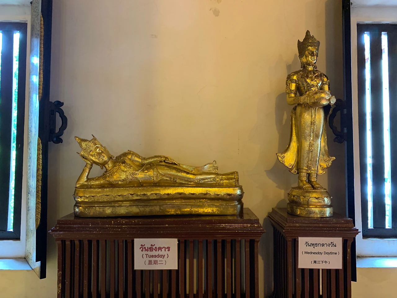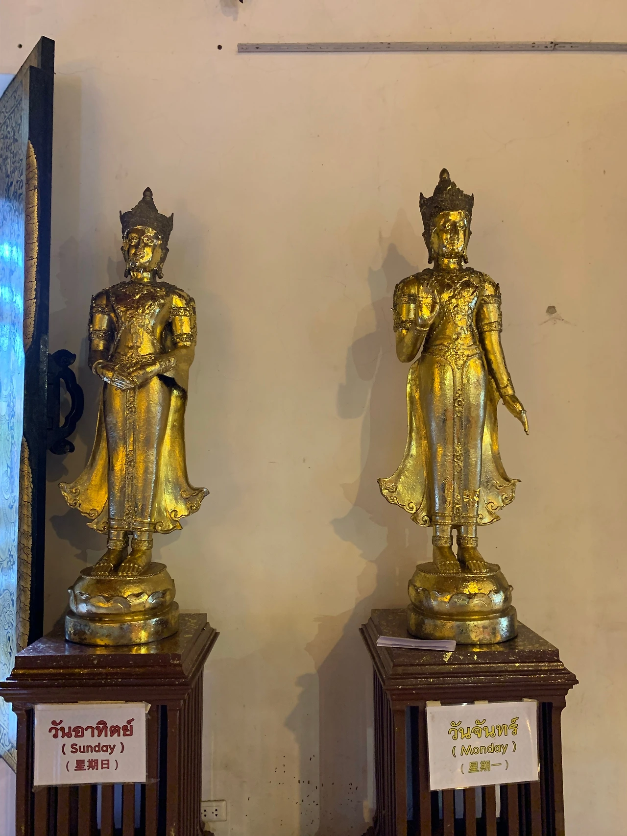 니콜라스가 키득대며 가리킨 벽에는 ‘요일 부처님’이 조로롬 늘어서 있다. 태국 사원에서 자주 보이는 불상이다. 태국 사람들은 태어난 날에 따라 모시는 불상이 다르다. 각 불상은 요일마다 탁발을 하거나(수요일 오전) 명상을 하는(목요일) 등 각기 다른 포즈를 취한다. 부처님의 행적에 따라서다. 화요일 부처님은 뭘 하고 계시길래? 찾아보니 누워 계신다. “월요일 밤에 파티가 있으셨나...” 얄미운 그를 꽁 쥐어박으려 하자 그는 월요일 부처님처럼 손바닥을 내밀며 워워, 한다. 태국에서 요일 부처님은 믿음 이상의 친숙한 존재다. 요일별로 사람의 성격과 직업군, 행운의 색까지 알려준다니... 우리는 부처님이 별자리 같다며 웃는다. 종교가 이토록 친근하니 사람의 삶 속에 배어들지 않을 수 없겠다. 사람들은 입구에서 산 얇은 금종이를 자신의 요일 불상에 붙이고 기도를 드린다. 흥미로운 시주다.