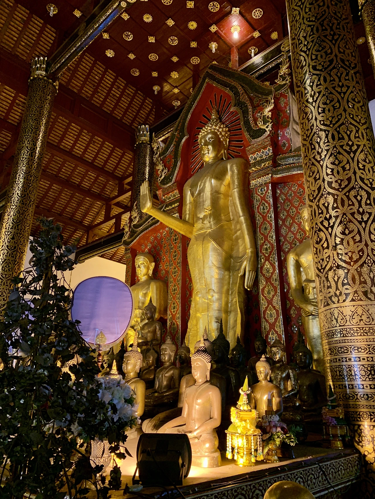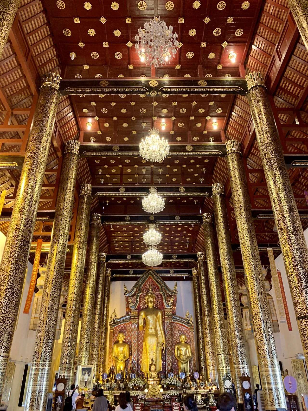 신발을 벗고 대법전으로 들어간다. 높은 천고에 세로로 길게 뻗은 법당. 바닥엔 빨간 카펫이 깔려 있고 카펫 끝에는 키 큰 부처님이 서 있다. 우리나라의 사원이 가로로 길어 문밖에서도 부처님을 자세히 볼 수 있는 것과 달리. 태국의 큰 사원 속 부처님은 높이 그리고 멀리 있다. 금빛 몸과 붉은 후광을 가진 부처님처럼, 바닥에 깔린 붉은 카펫과 천장에 드리운 붉은 실크는 아래 위로 대칭을 이루며 그를 이어주는 기둥과 창문, 샹들리에의 금빛과 조화를 이룬다. 카펫을 따라 한 발 한 발 내딛는다. 금부처님은 손바닥을 보이며 두 명의 작은 부처님과 함께 온화하게 서 있다. 현지인들이 무릎을 꿇고 앉아 기도한다. 금기둥과 벽 사이로 소원 조각들이 팔랑거린다.