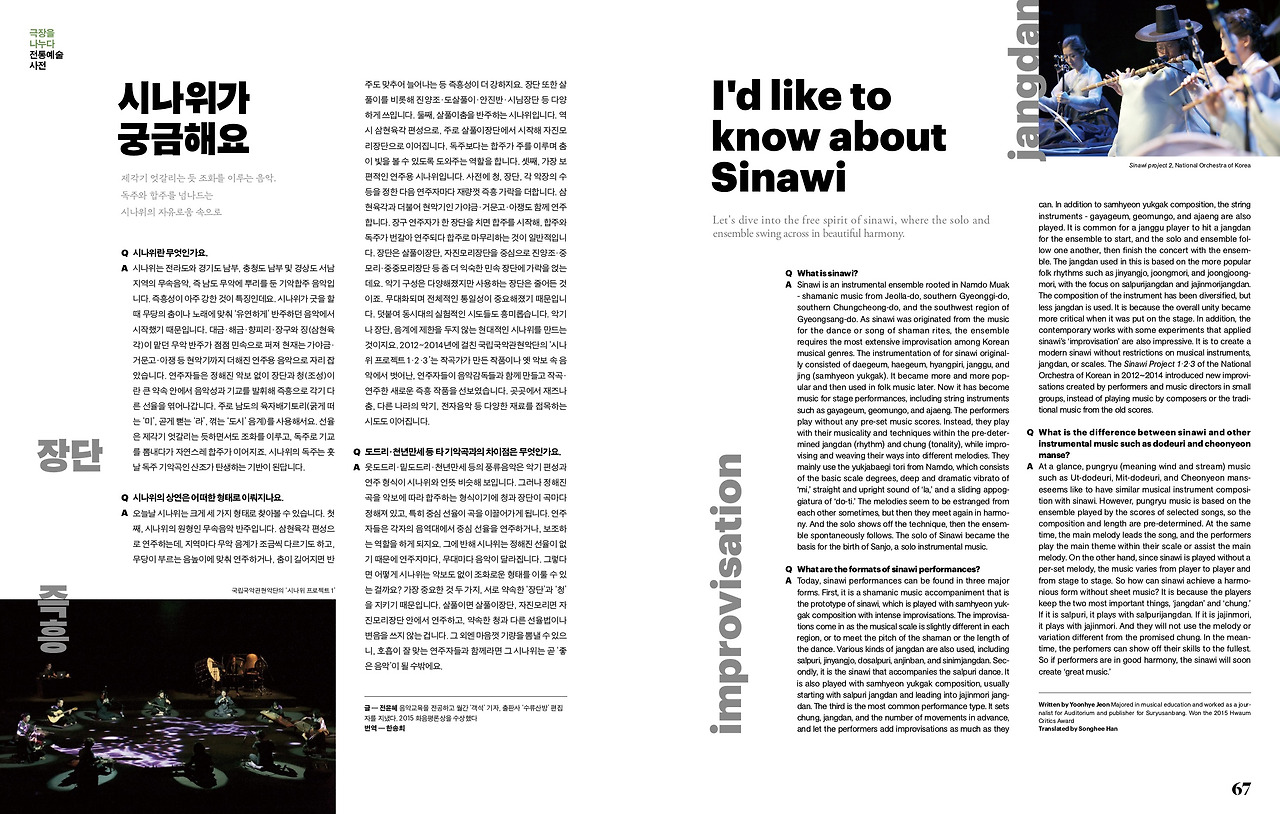 덧붙여 동시대의 실험적인 시도들도 흥미롭습니다. 악기나 장단, 음계에 제한을 두지 않는 현대적인 시나위를 만드는 것이지요. 2012~2014년에 걸친 국립국악관현악단의 ‘시나위 프로젝트’는 작곡가가 만든 작품이나 옛 악보 속 음악에서 벗어난, 연주자들이 음악감독들과 함께 만들고 작곡· 연주한 새로운 즉흥 작품을 선보였습니다. 곳곳에서 재즈나 춤, 다른 나라의 악기, 전자음악 등 다양한 재료를 접목하는 시도도 이어집니다.