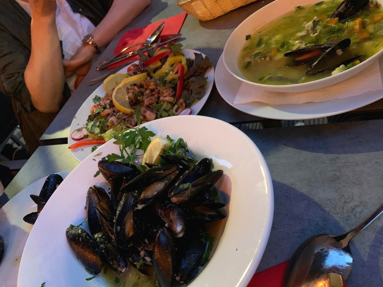 다음날 우리는 중국집 맞은 편의 옆집, 정체 모를 레스토랑으로 향했다. 피자와 파스타를 팔던 곳 옆집 말이다. 자신감 넘치는 발걸음을 옮기며 오늘도 성공하리라 굳게 믿었다. 전날의 성공과 더불어 야외 좌석 가득한 현지인들을 보자 확신이 들었다. 맛집이로구나! <Abbazia>는 지중해식 요리 전문점이었는데 주 1회 해산물 뷔페를 운영한다고 했다. 사실 배가 고프지 않았기 때문에 뷔페는 무리였다. 가벼운 요리로 몇 개 시켜서 나눠 먹으려는데 역시나 사진 없이 비문학 지문처럼 설명만 줄줄 쓰여 있는 메뉴판을 이해하기란 불가능했다. 그때 눈에 띈 게 테이블마다 자리 잡은 까만 홍합 뭉텅이.