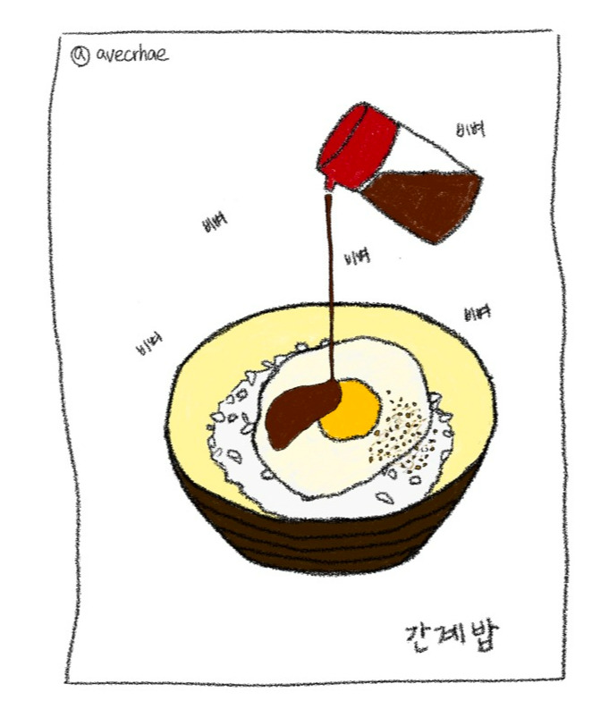 버터가 끝이 아니었다. 다른 '조리법'도 있었다. 바로 버터 계란밥보다, 우리 집 간계밥보다 짧은 조리 시간을 기록한 날계란밥이다. 그네 집은 일본풍 간장 계란밥을 선호하여 일단 밥그릇에 밥을 푸고, 날계란을 까서 넣고, 그 위에 계란과 참기름을 뿌린 후 살살 조금씩 비벼 먹었다.