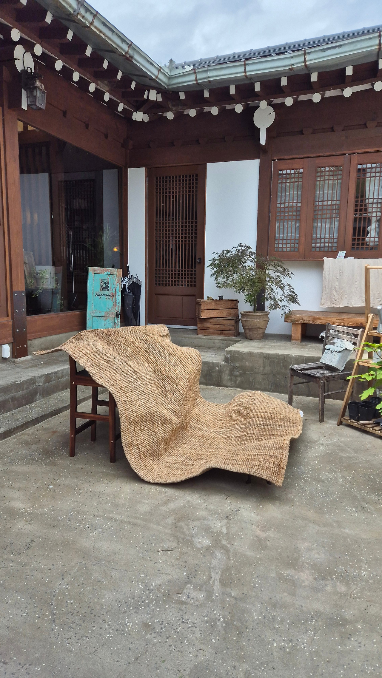헹구고, 헹구고, 또 헹궈서 겨우 거품을 빼고 담벼락에 걸어서 말리려다가 무게에 짓눌려 옆으로 비틀거리다가 풀썩 주저 안고 말았다. 성질이 날 것 같아 의자를 꺼내와 마당 한가운데에 조형물처럼 걸어버렸다. 덕분에 주말 동안 마치 작품을 구경하듯 젖은 카펫을 유심히 살피다가 들어오는 손님들을 보며 새어 나오는 즐거운 웃음을 삼켰다. 완전히 마르기까지 장장 4일이 걸린 이 카펫은 원래 자리에 마치 아무 일도 없었다는 듯 들어가 있다. 정말 얄밉다.