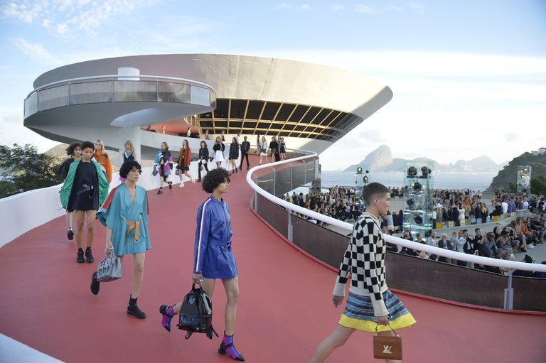 바다와 산이 어우러진 브라질의 도시 리우 데 자네이루의 한켠에 자리한 퓨처리스틱한 건축양식의 현대미술관. 꼭대기에서부터 이어진 구불구불하고 기다란 길을 따라 내려오는 모델들은 마치 새로운 행성에서 지구로 행진하는 듯했다. 관객들과 멀리 떨어져 있는 높은 지점에서 시작해 점점 더 가까워지는 이 루트는 관객들에게 기대감을 선사했다.