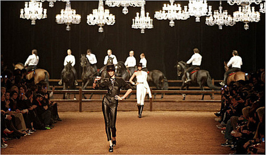 마구 용품을 제작하며 시작된 명품 브랜드 에르메스(Hermes). 그들의 탄생 취지에 맞게 2010년에는 아예 마구간에서 그들의 컬렉션을 발표했다 (천장은 샹들리에로 장식해 기품 있게 연출했다). 승마복을 갖춰 입은 채 말에서 내려 채찍을 들고 워킹하는 모델의 자태를 보아라.