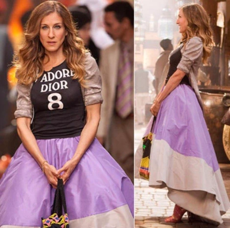 두 번째 영화의 해외 촬영지인 아부다비에서 전 남자 친구와 재회하는 유명한 장면에서는 캐주얼한 티셔츠에 무대의상처럼 화려한 부풀린 스커트를 같이 입습니다.