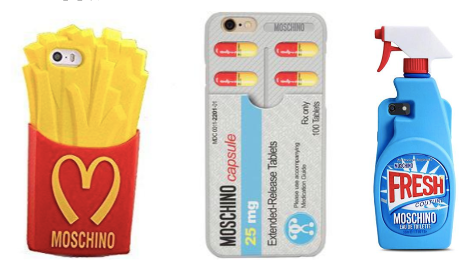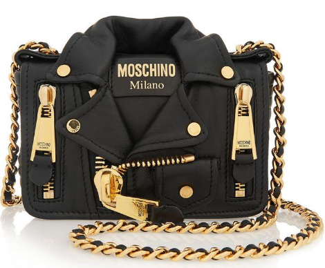 모스키노는 컬렉션의 화제성만큼이나 골수팬들이 환호하는 시그니처 아이템도 몇 개 발표했는데 개중에는 가죽재킷 형태를 띤 핸드백 (모토 백)과 감자튀김, 약봉지, 페브리즈의 형태를 띤 독특한 폰 케이스 등이 있다.