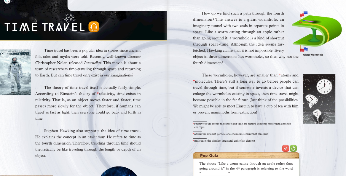 정확한 문해적 해석은 “지렁이가 사과 겉을 따라 이동하는 것이 아니라, 안을 뚫고 가는 것처럼 공간에도 그런 지름길이 있어서 시간 이동이 가능할 수 있다는 의미다.”라고 설명할 수 있어야 한다. 이 수준에서는 단순한 해석이 아니라 비유를 실제 개념으로 바꿔 이해하는 능력이 필요하다.