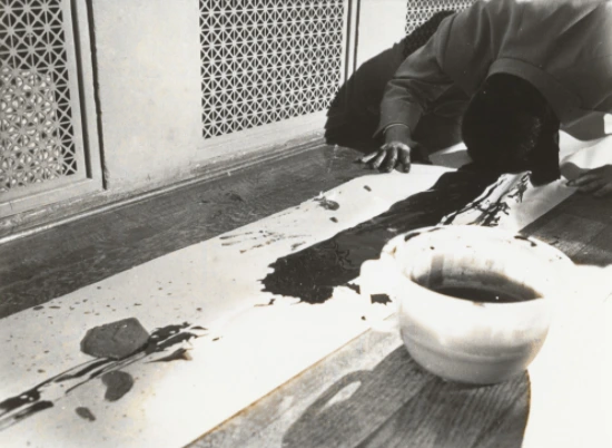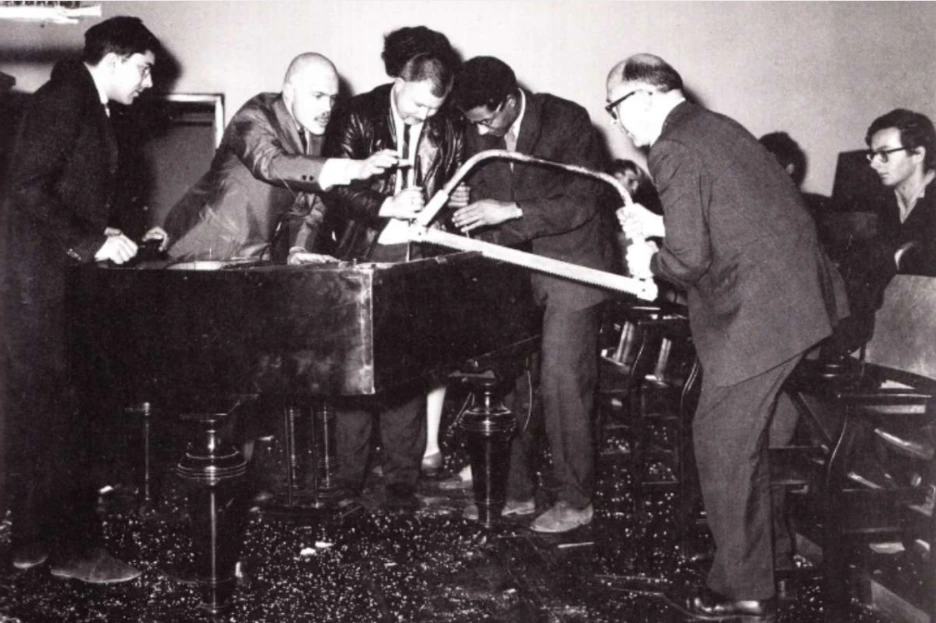 (좌) 톱으로 피아노를 썰고 있는 필립 코너 (우) 머리에 먹을 묻혀 그림을 그리는 백남준