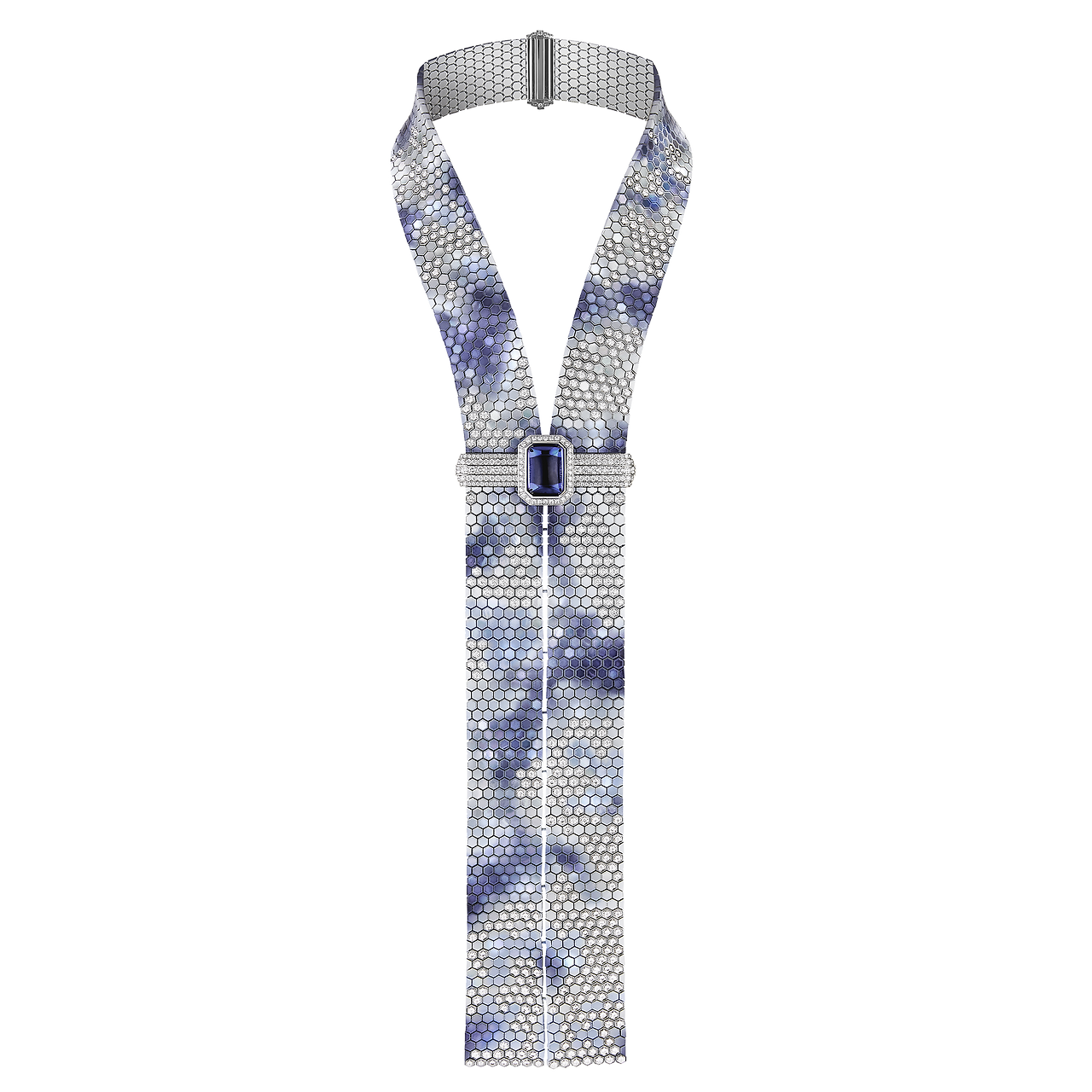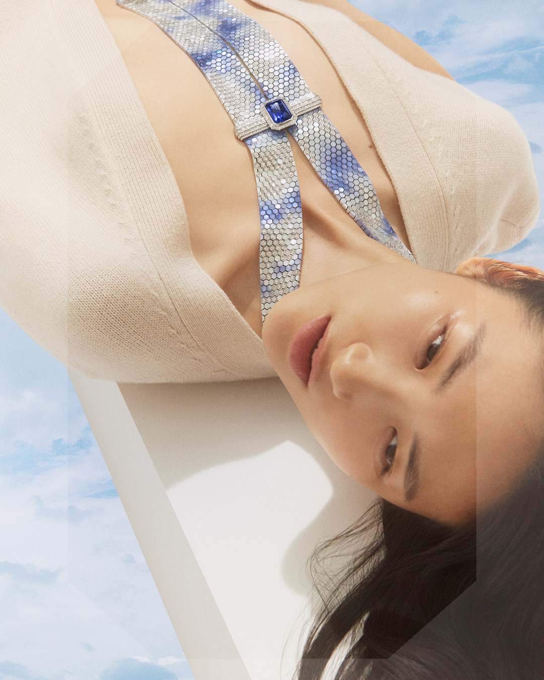 먼저 육각형 조각의 티타늄 메쉬로 유연한 캔버스를 만들었고, 그 위에 슬레이트 컬러의 래커페인팅으로 짙은 하늘 빛을, 마더오브펄(자개)과 다이아몬드로 하얗고 반짝이는 구름을 살포시 얹어냈다. 출렁이는 티타늄메쉬와 반짝이는 다이아몬드와 컬러스톤을 통해 1초의 시간, 1도의 각도 차이로 전혀다른 하늘을 볼 수 있는 부쉐론만의 오픈 스카이가 탄생한 것이다. 그래, 오마주는 이렇게 하는