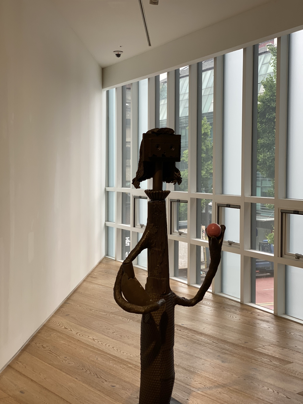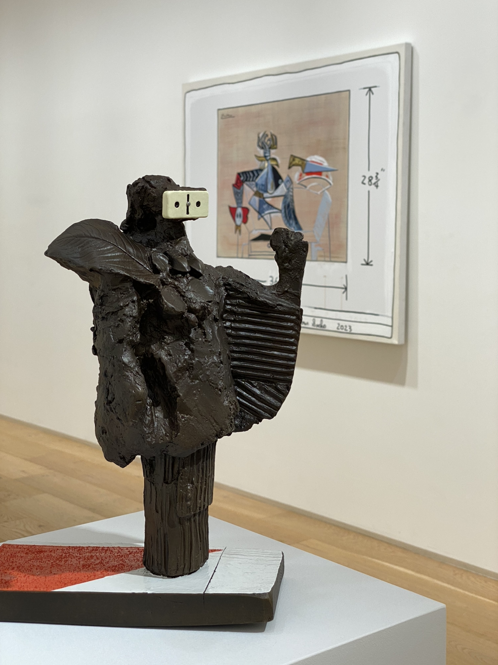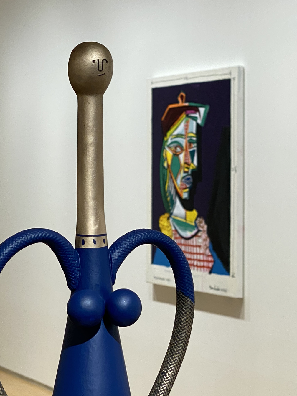 작가는 피카소의 작품을 적극적으로 재현했다. 단순한 오마주를 넘어서는 포인트를 두 가지 정도 짚어낼 수 있었다. 먼저 그는 자신의 장기 중 하나인 브리콜라주(bricolage) 기법을 사용해 작품을 만들었는 점이 눈에 띄었다. 브리콜라주는 주변에서 구할 수 있는 재료를 즉흥적으로 조합해 새로운 것을 창조하는 기법으로, 톰 삭스는 평소 골판지, 합판, 덕트 테이프 등 일상 재료를 가지고 별의별 것을 다 만들어내는 것으로 잘 알려져 있다. 이번에도 볼링 핀, 대걸레 등을 활용해 피카소의 조각을 절묘하게 재현해 보는 이들에게 즐거움을 선사한다.