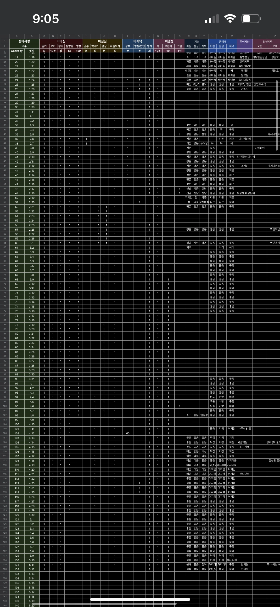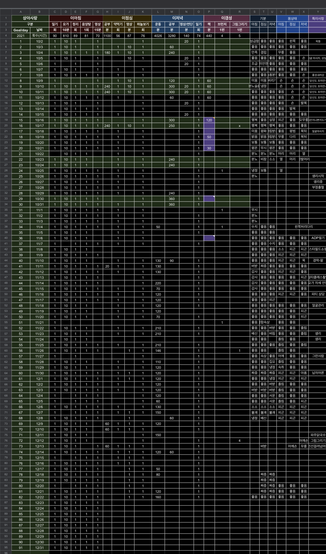 여기에 애플워치 운동 기록, 수면기록, 생리주기를 종합해서 분석해보고자 하는 욕구가 있는데 이렇게 결측치가 많아서야 ㅎㅎㅎ 좀더 분발 해야겠다!
