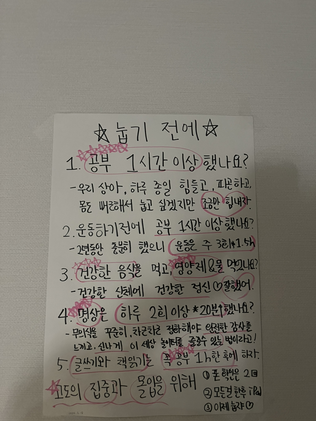 그리고 영어공부를 한시간 안 하면 운동을 못하기로 나와 약속을 했잖니, 너도 내 침대 위에 붙여놓은거 봤잖아. 그래서 그런거야. 그리고 운동을 하면 너무 오래하고 계속하니까 주 3회로 제한을 건거지.