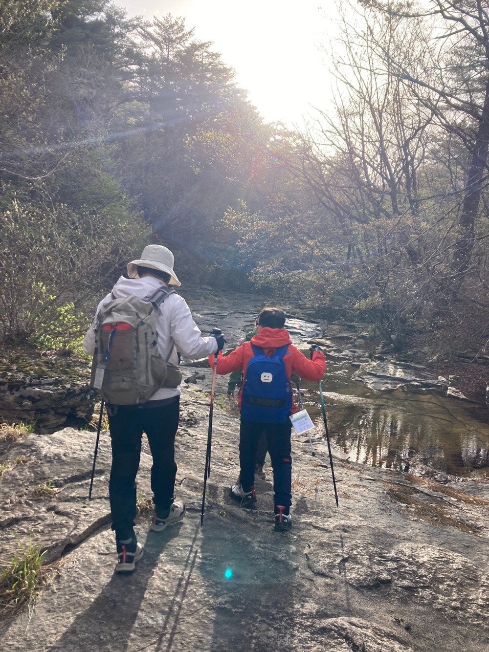오늘 가는 이기령-백봉령 구간은 태백산에 있는 길이다. 백두대간 38구간 길로도 불린다. 오늘 걸을 거리는 15.6km다. 차만 타면 조금이라도 더 자 두려고 잠을 청하기 바빴는데 어째 잠이 오지 않았다. 어느새 휴게소다. 휴게소 광장 하늘에 구름이 가득하고 바람이 차다. 버스에서 내려 백두대간길까지 가기 위해 부수베리 계곡길을 지나야 했다. 아름답다는 탄성이 곳곳에서 들리는데 긴 산행을 시작하는 어린이의 컨디션을 살피느라 고개 들 여유가 없었다. 여기만 가족들과 다시 오겠다는 다짐도 들렸다.