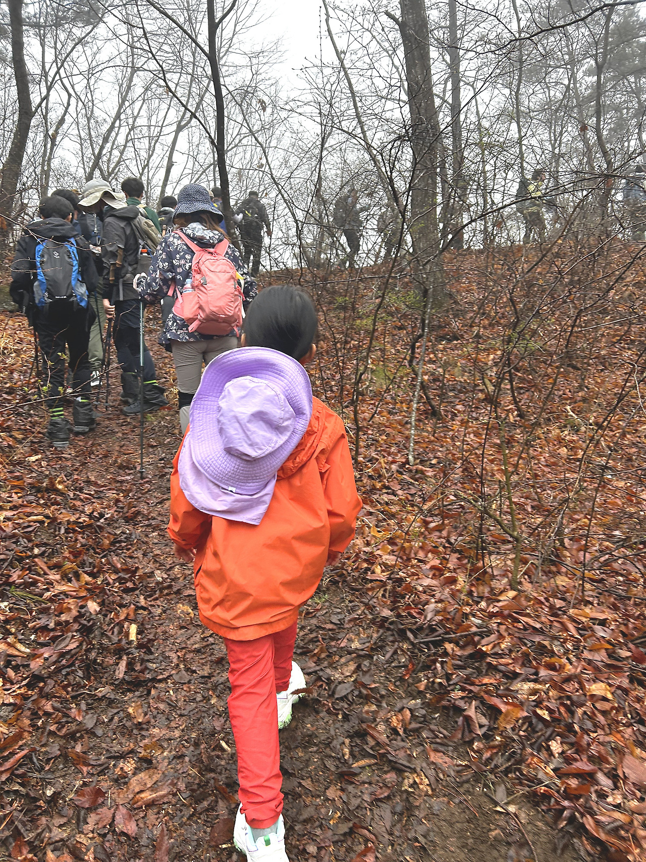 와 있다. 남편의 보온병에 다행히 물이 남아있다. 선두의 점심식사가 끝나고도 사람들이 계속 도착한다. 얼마 후, 인해가 뛰어온다. 아빠 무릎에 자리 잡고 앉아 라면을 먹으며 재충전한다. 여기까지 온 아이가 대견하고 기특하다. 아빠가 선두대장이라 먼저 가야 한다니까 아빠 손을 놓아준다. 힘들다, 업어 달라, 못 가겠다 매달리던 아이의 태세전환이 놀랍다. 이 큰 무리 안에서 아빠의 체면을 존중해주고 있다. 좁은 오르막 계단이 시작되는 곳 앞에 자연스레 줄이 만들어진다. 아이와 떨어져 가고 싶어 줄 앞에 끼려 하니 “어머니, 여기서 이러시면 안 돼요!” 소리가 들린다. 출발하는 사람들 수를 세고 있는 분이 빙긋이 웃고 있다. “딸이랑 좀 떨어져 가야 해서요.”라고 알리니 “특수 상황이니 어서 앞으로 가세요” 라며 사이를 넓혀 끼워 보내준다. 아마 이 분도 이 중 한 학생의 부모일 것이다. 아직 서로 낯선 이들을 믿고 의지해 새로운 길을 가고 있다.