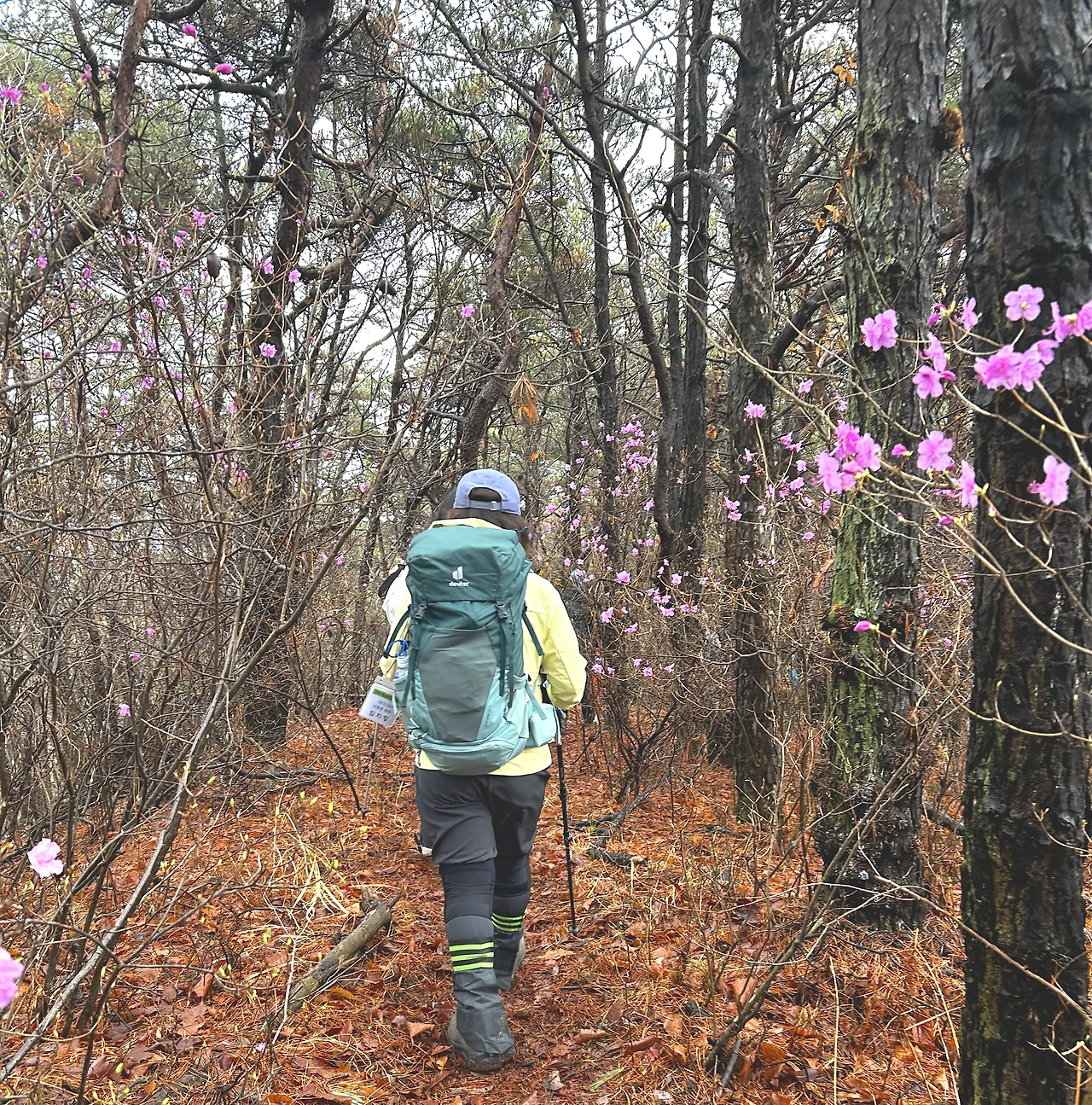 아이와 나는 점점 뒤처져 꽁지 그룹이 되었다. 우리가 쉬면 후미대장님들도 같이 멈췄다. 그분들 보다 뒤로 처질 수는 없었다. 오르막에서 아이 등을 밀어주며 가는데 갑자기 아이가 뒤를 돌아섰다. 뒤따라가던 어른들이 한눈에 들어오는 무대가 되었다. “내가 마술 보여줄게.” “이건 신기한 거야. 재밌는 거야.” 하더니 깍지 껴 맞잡은 두 손의 검지를 교차해 양 콧볼에 댄다. 손깍지를 풀었더니 검지와 양팔이 꼬이지 않고 제자리로 온다. 후미 대장님들이 박수로 화답한다. 여기저기서 따라 해 보는데 교차했던 검지를 풀면 두 팔이 교차해 있다. 쉬워 보이지만 따라 할 수 없는 그야말로 마술이다. 언덕을 지나 시작할 때 같이 갔던 언니들과 만났다. 오빠와 같은 반인 슬혜 언니가 인해를 쓰다듬으며 “힘들었지?” 다정한 말을 건넨다. 엄마한테 전해지는 것과 다른 것이 아이에게 전해진다. 지켜보니 아이의 투정은 언니들과 멀어지면 시작되고 언니들이 보이면 달려가며 사라졌다. 다시 언니들과 만난 김에 아까 그 아저씨한테 가서 배낭을 받아오겠다 하고 앞서 나갔다. 후미 대장님들도 아이와 조금 떨어져 가는 게 낫겠다 하신 터였다. 12시 넘어가니 찬 기운은 좀 가셨다. 진달래가 간간이 한 두 송이씩 피어 있었다.