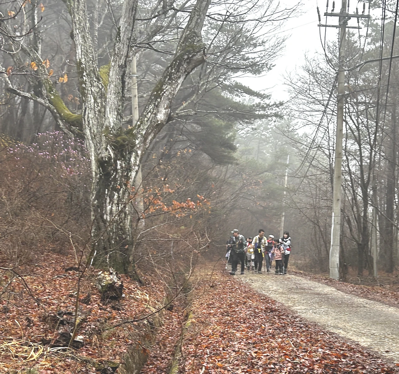 버스 내린 곳이 낯익다. 앞 산행의 식사 자리였던 권포리 마을회관 앞이다. 거기서 체조를 시작했다. 출발 전에 단체사진을 찍고 나서 어린이 참가자만 따로 찍었다. 올해 중1, 고1 신입생과 동생들 참가자들 만으로 플래카드 뒤로 여러 줄이 만들어졌다. 인해와 설아가 초등학교 1학년으로 최연소 참가자고 그 위로 나이대별로 촘촘히 이어져 있었다.