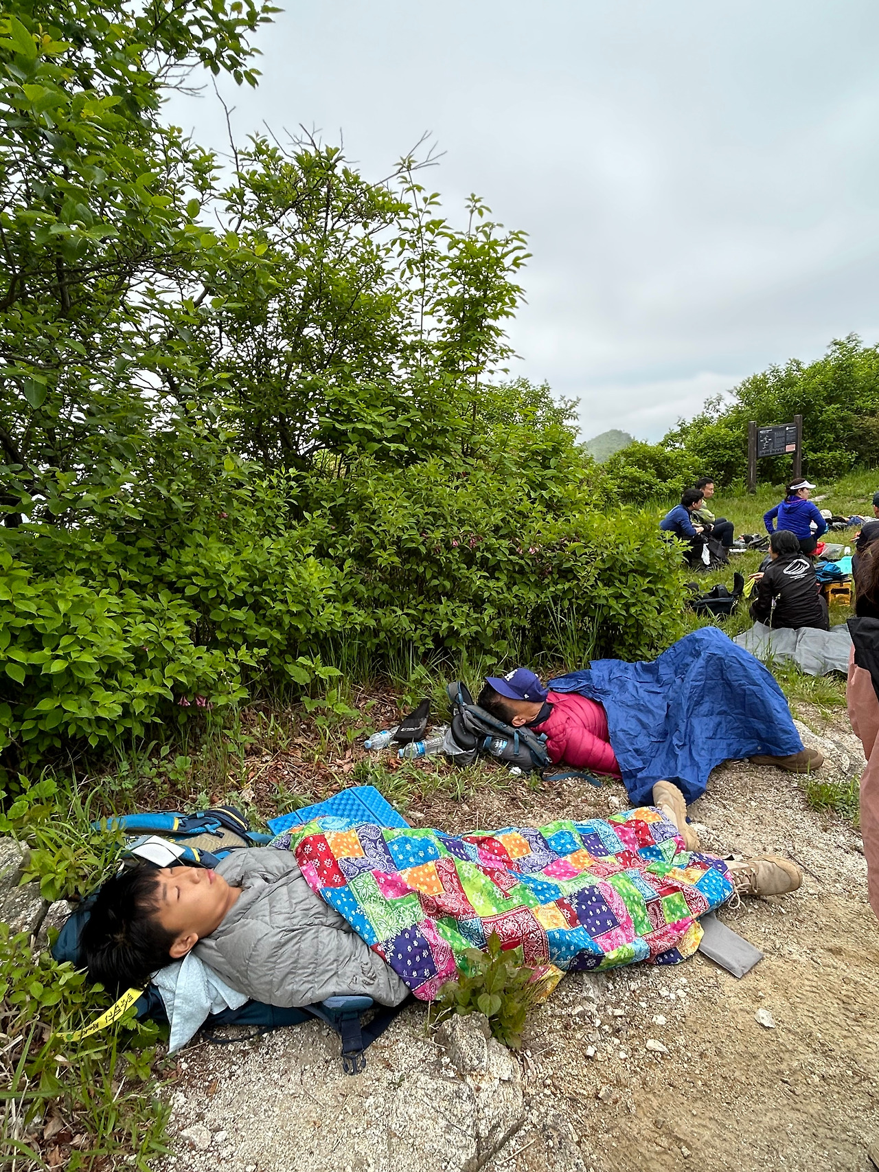 긴 산행을 하다 보니 체력을 최대한 아끼고 빨리 회복할 수 있는 방법에 골몰하게 된다. 간식은 뭘 먹을까, 얼마 만에 쉬어야 할까 등등. 돗자리를 펴고 누워서 쉬는 가족을 보니 회복이 빠를 것 같았다.