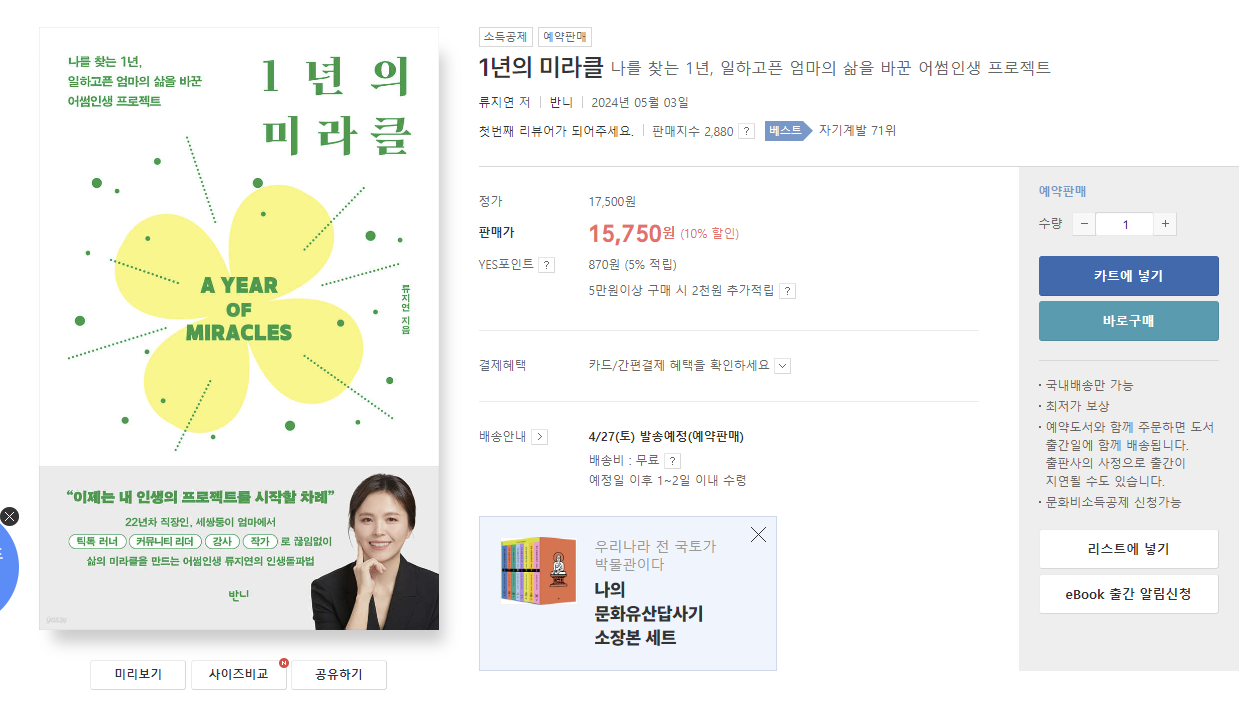 오늘 출판사와 통화를 했습니다. 판매지수 관련 설명도 해주시고, 드디어 다음 주에 영등포 교보문고 평대에 깔릴 계획이라고 합니다. 계획이니, 실제 딱 마주하는 그 순간이 될 때까지는 기쁨을 잠시 보류~!