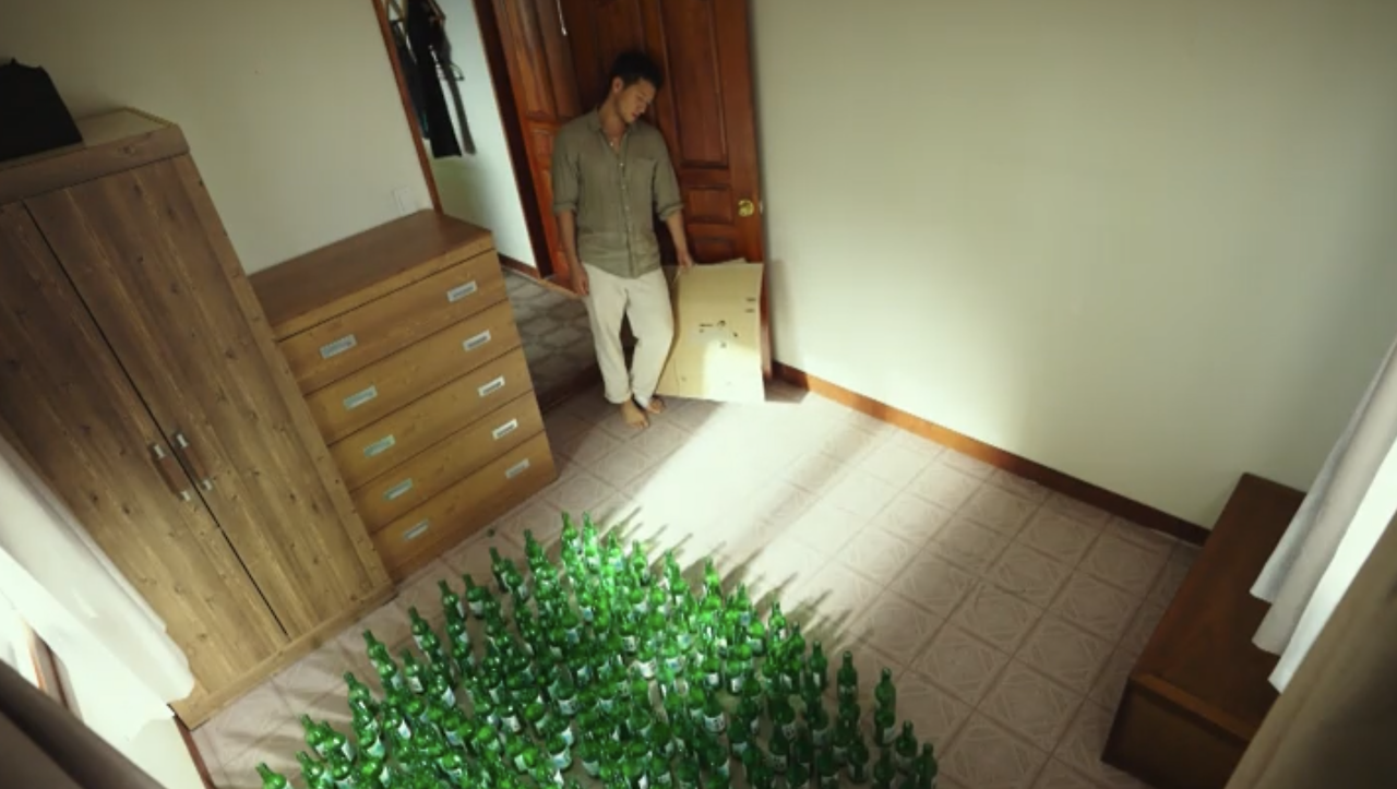 구씨는 매일 소주를 마시며 시간을 보내는데 그 병을 치우지 않았다. 방에 한가득인 병을 치우려다 엄두가 나지 않는지 이내 포기한다.
