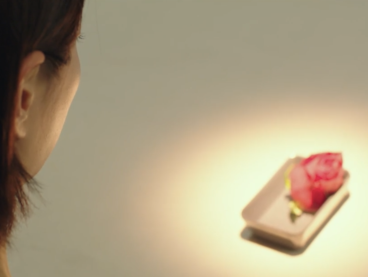 간장 종지에 물 담아 장미를 눕혀놓은 기정.
