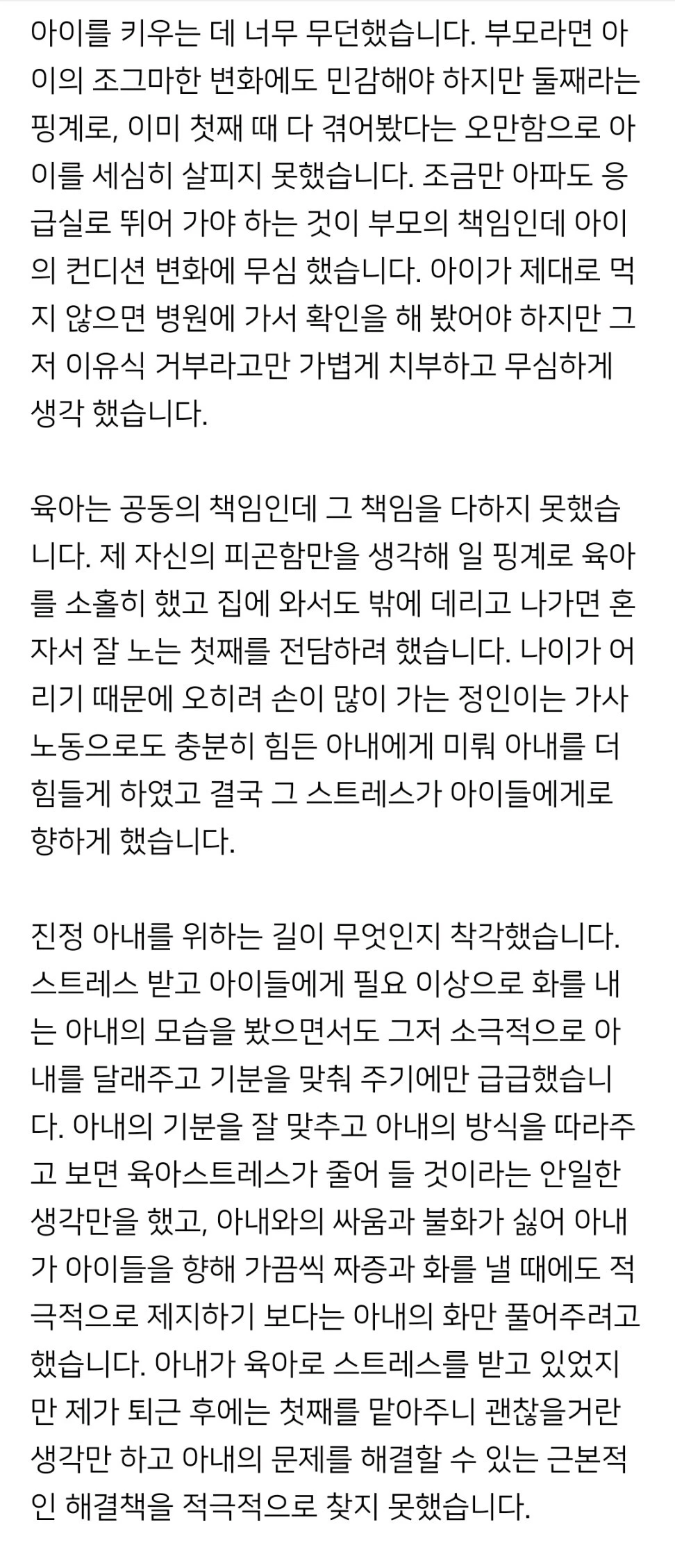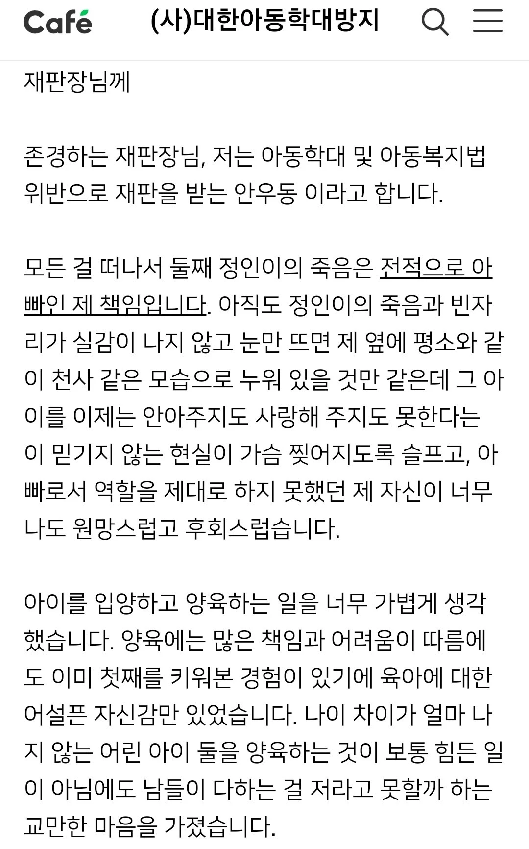 내내 담담하다가 반성문 말미에 친딸을 언급할 때는 글이 제대로 이어지지 않는 걸 보니 그제야 가슴이 미어졌나 보다. 사람이 이럴 수 있나. 어찌 그리 친딸만 소중할까..