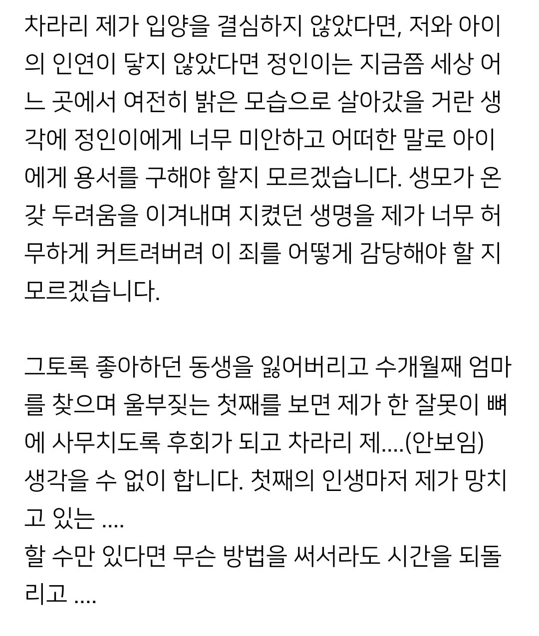 입양하지 말걸 내가 왜 입양을 해서 우리 아내 고생시키고 우리 딸 울게 할까, 후회하는 내용되시겠다.