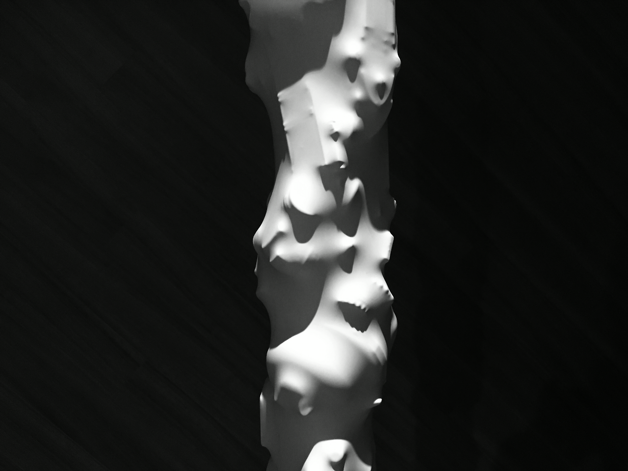 4. 작가는 '무엇인지 모르겠는 형상'을 우리에게 건네며 역설적으로 그것이 우리 모두의 기억이 되도록 이끈다. 관람자는 이 '형태를 알 수 없는 것'을 독해하려 애쓰며 스스로의 기억을 덧입힌다. 그리고 그러한 행위 속에서 이 순백의 기둥에 본인의 기억을 투영한다. 우리에게 투영된 형상은 어렸을 때 가지고 놀다 버린 장난감이 될 수 도, 고통스러운 기억에 몸부림치던 찌푸린 내 얼굴 일 수 도 있다. 동시에 그것은, 기억에서 필요해 의해 버려진 시간이 고통스럽게 절규하는 외침 일 수 도 있겠다.