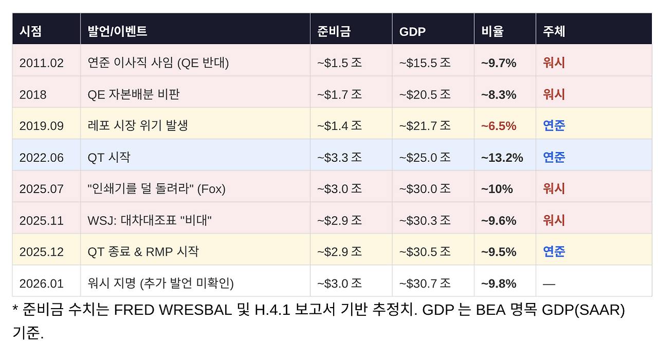 2025년 11월에 지급준비금/GDP 비율이 9.6%로 내려왔을 때에도 대차대조표가 비대하다고 언급한 것으로 보아 지금보다 더 비율이 줄어야 한다고 판단하는 듯하다.