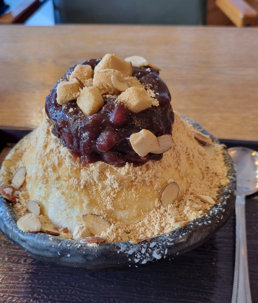 출입문 종소리에 체격 좋고 무섭게 생긴 주인아저씨가 굵직한 목소리로 나를 맞았다. 눈꽃빙수와 호두과자를 주문한 뒤 창가 쪽에 자리를 잡고 앉았다. 젤리나 과일 같은 장식물이 일절 없는 투박한 모양의 빙수에 이어 삐져나온 살집이 매력적인 호두과자 한 접시가 내 앞에 놓였다. 먹어보지 않아도 맛을 가늠할 수 있지만 그래서 더 안 먹고는 못 배기는 맛. 익히 아는 그 맛 앞에 숟갈을 들었다.