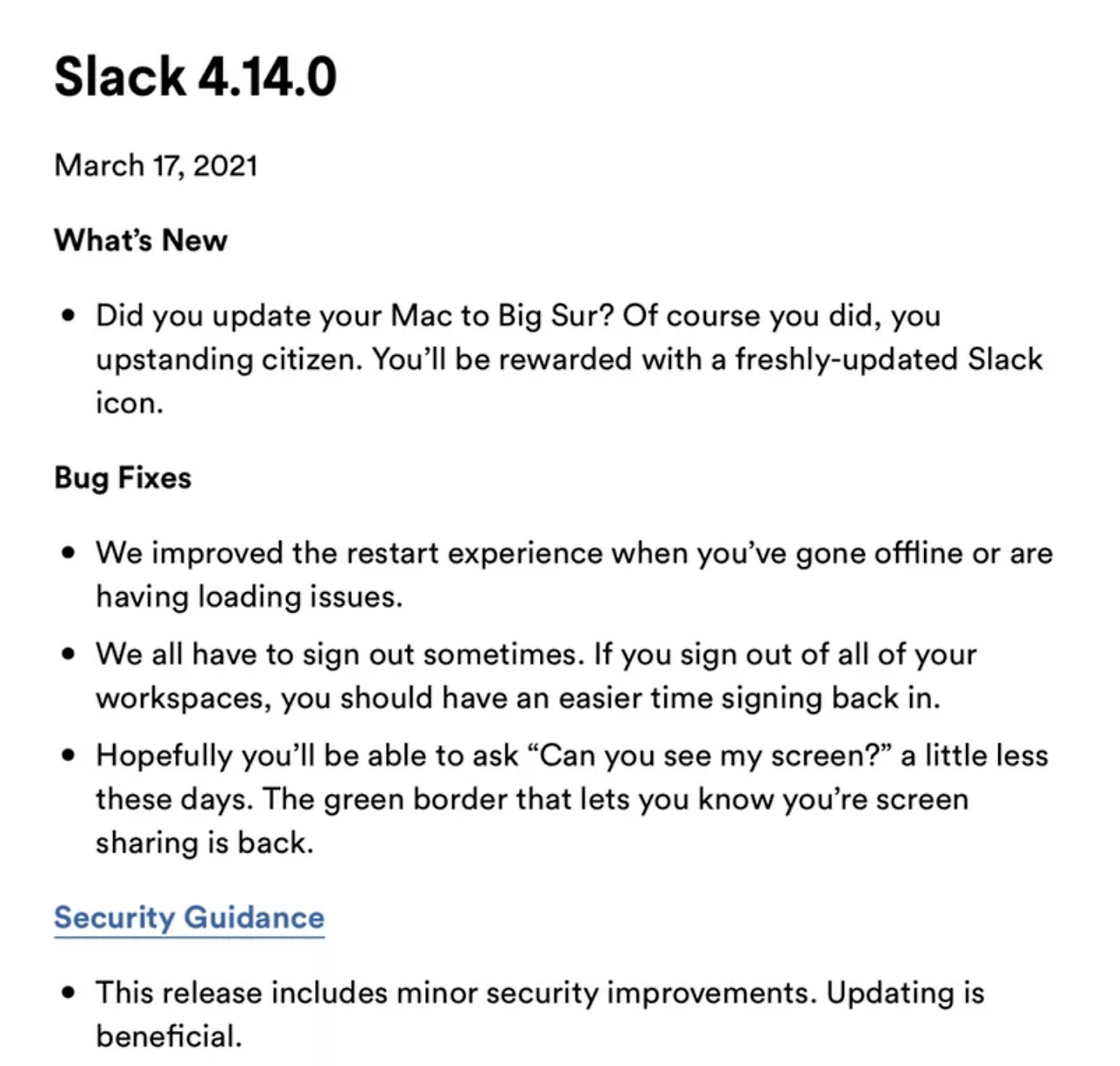 업무용 메신저 툴인 슬랙(Slack) 팀은 릴리즈 노트를 잘 쓰기로 업계에 정평이 나있어 예시로 들고 왔다.