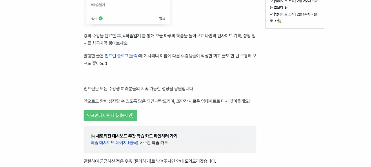 그럼에도 작성한 노트에 유저들의 반응이 나타나는 걸 보며, 릴리즈 노트를 작성하는 일이 꽤나 번거로운 일처럼 느껴질 수 있지만, 서비스가 나아가고 있는 방향을 유저에게 투명하게 공유하고 피드백을 받을 수 있는 커뮤니케이션 수단이 되기도 한다는 걸 깨달을 수 있었다. 뿐만 아니라, 릴리즈 노트는 같은 공간에 오랜 기간에 걸쳐 차곡차곡 쌓이기 때문에 유저로 하여금 서비스가 지속적으로 성장하고 있음을 알릴 수 있는 방법이 되기도 한다는 것 역시 알게 되었다.