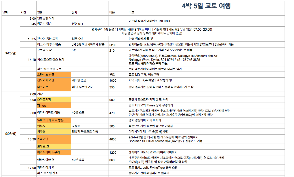 처음에는 4박 5일이라는 시간을 어떻게 최대한 효율적으로 활용할 수 있을까? 고민 끝에 이틀은 교토, 3일은 오사카에서 보낼 계획을 세웠다. 그런데 알아보면 알아볼수록 어쩐지 오사카는 딱히 들리고 싶지가 않았다. 한국의 명동과 같이 워낙에 도시 느낌이 강했고, 쇼핑과 먹방을 빼면 딱히 남는 게 없어보이는 여행지 같았다. (물론 가보지 않았으므로 섣부른 일반화에 불과하다.) 난 딱히 쇼핑을 즐기는 사람도 아닌데다 오사카 먹거리는 그다지 흥미가 가지 않아서, 차라리 관심이 가는 교토에 일정을 몰빵하기로 했다.