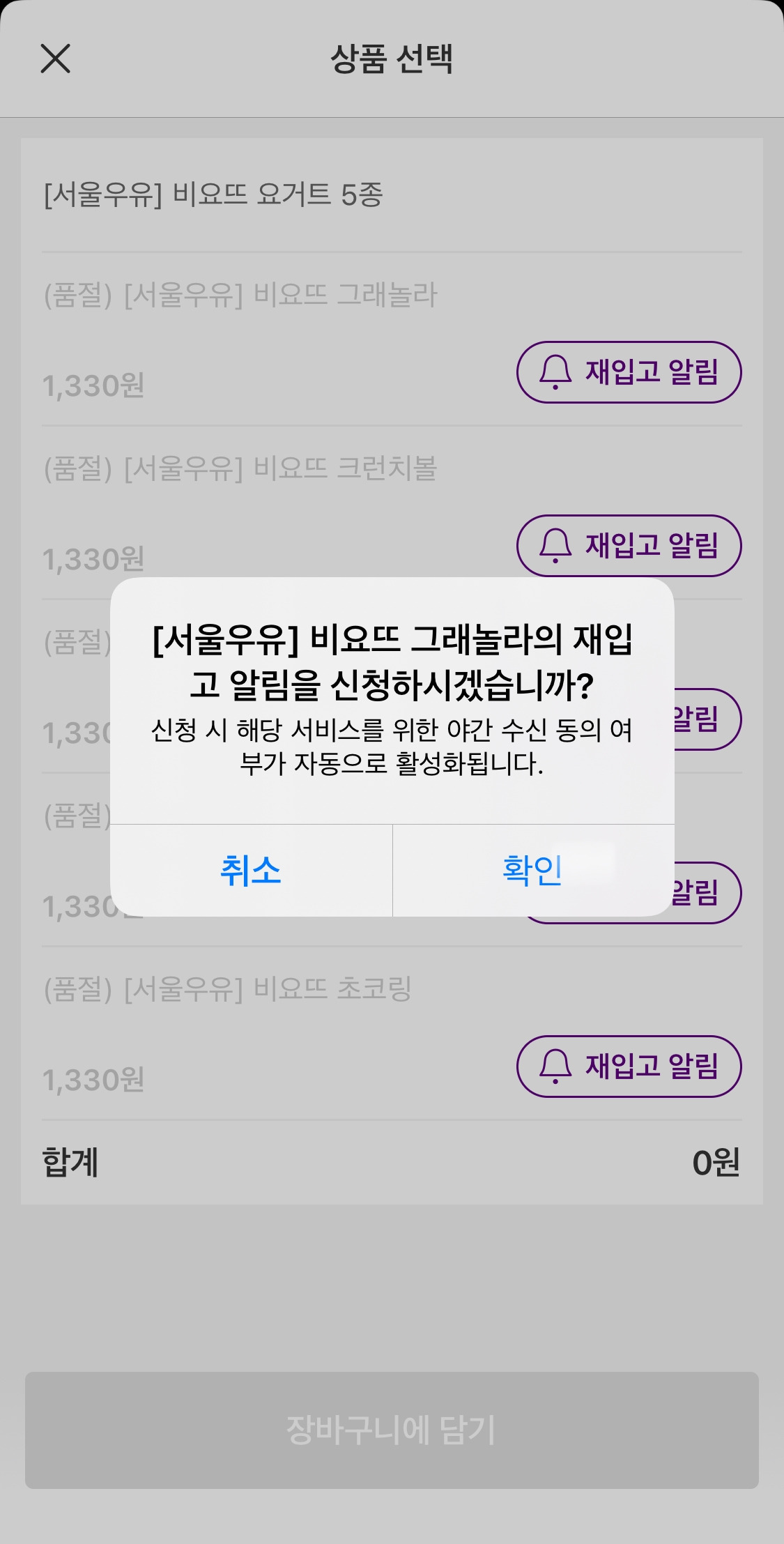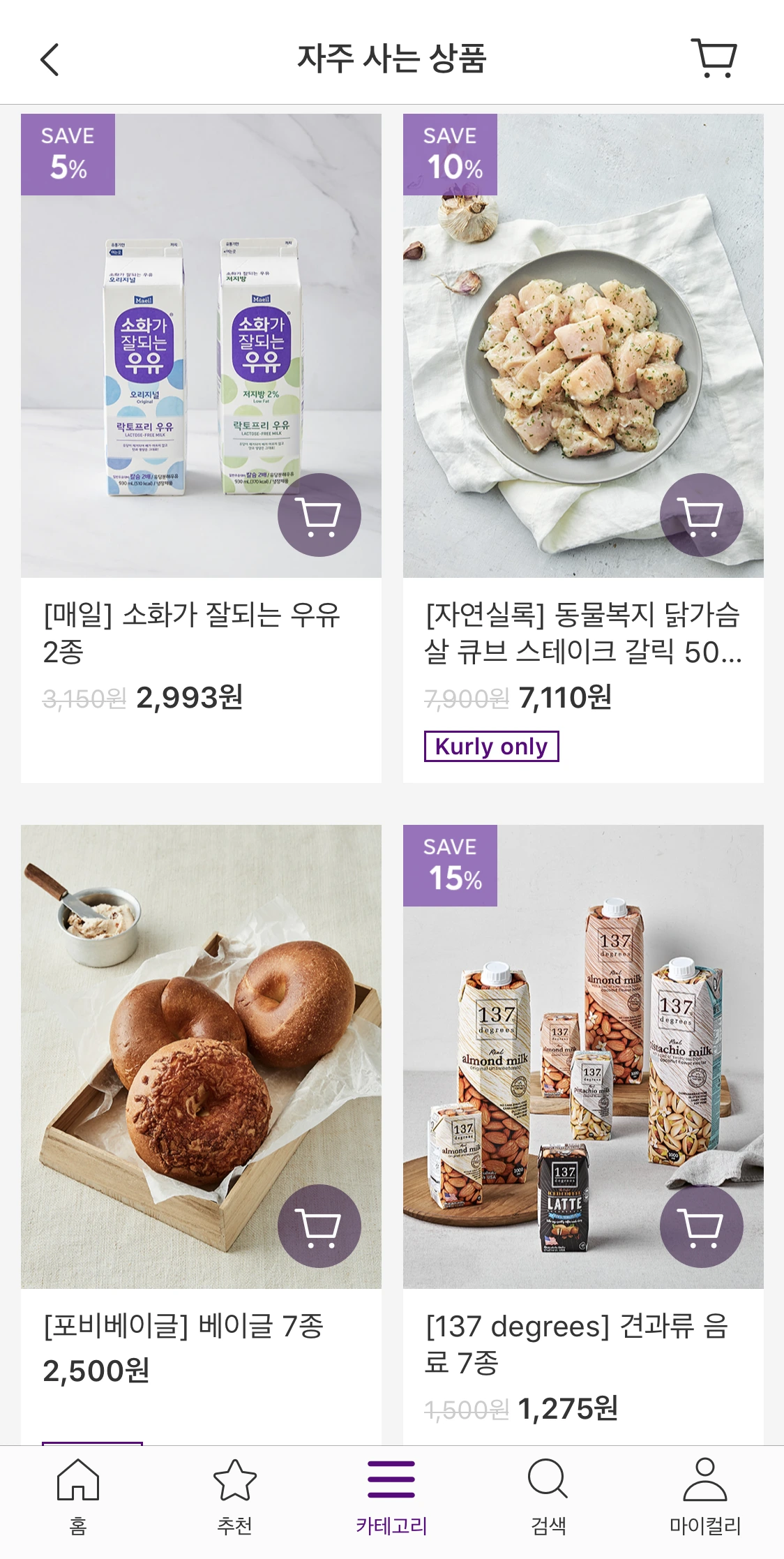 자주 사는 옵션 탭을 진입하면 이전에 내가 자주 구입했던 제품 목록이 발생된다. 어떤 데이터를 기준으로 리스트 업되는지는 아직 파악하지 못했지만, 적어도 n회 이상 구입한 이력이 있을 때 자동으로 이 항목에 추가되는 듯했다. 위와 같은 제품들만 해도 최소 2회 이상 주문한 이력이 있는 제품들이다. 웹으로 컬리를 이용하는 사용자들의 경우 수동으로 <늘 사는 것> 항목에 추가할 수 있다. 아쉽게도, 모바일 앱은 수동 추가 기능이 아직은 미 지원되는 듯하다.