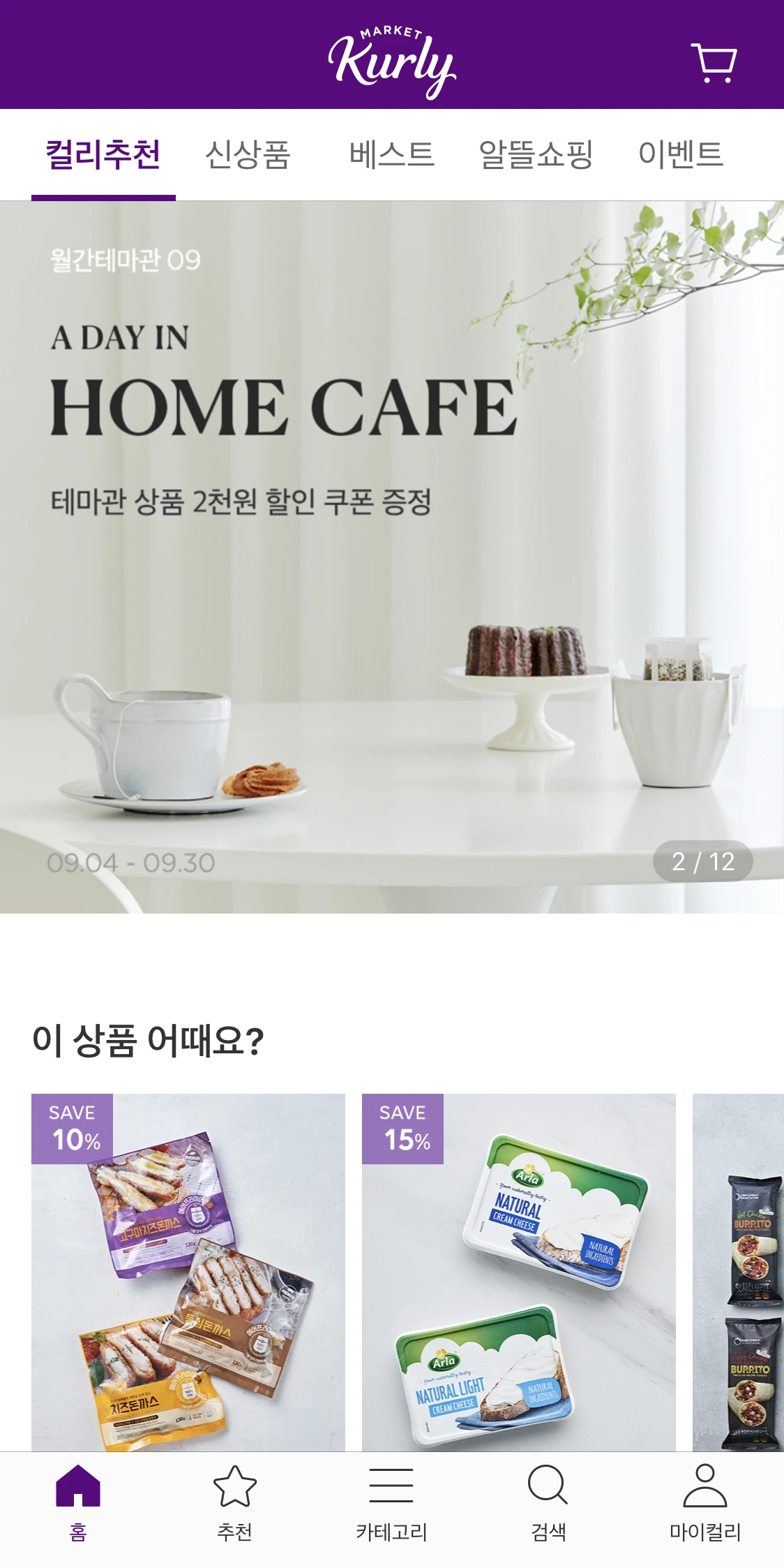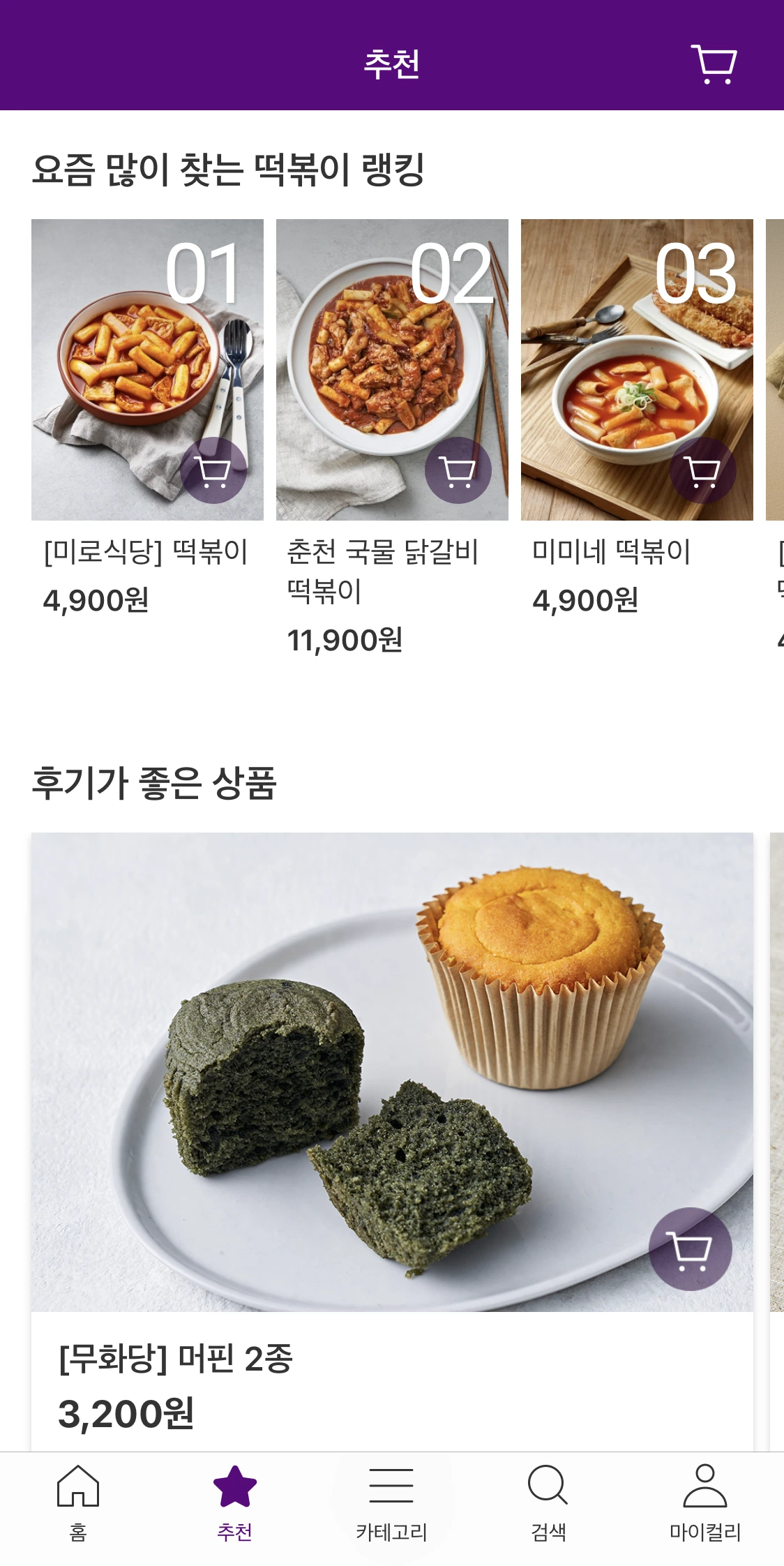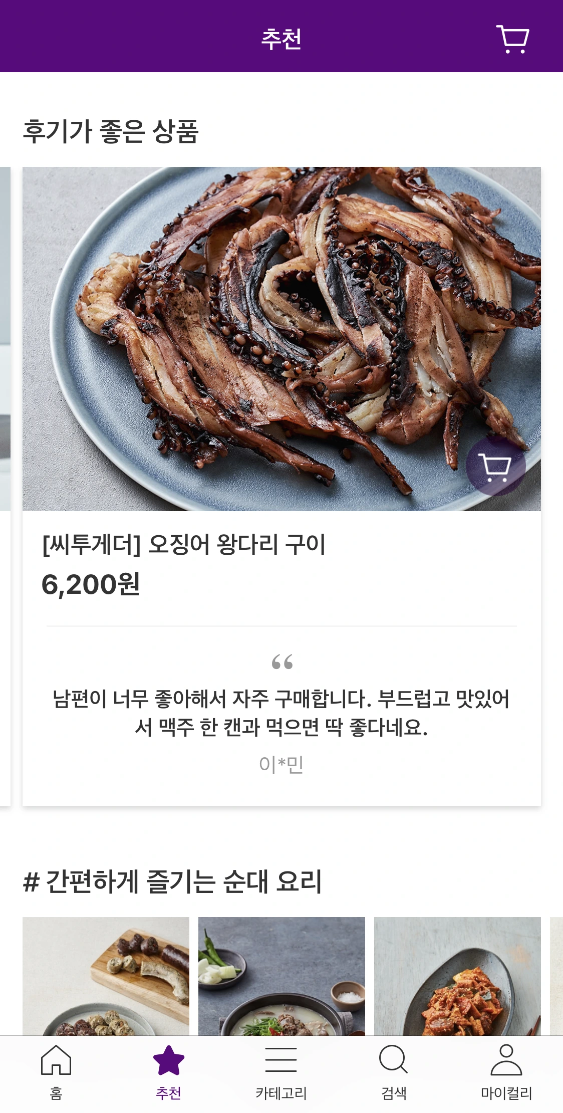 마켓컬리의 하단 추천 탭에서는 말 그대로 제품의 추천 기능을 사용할 수 있다. 내 경우, 주로 두어 개만 더 담으면 무료 배송이 될 것 같은데 뭘 더 담지? 할 때 [추천]탭을 구경한다. 대부분 잘 팔리는 베스트 제품이거나 할인율이 높은 제품들인데 고객이 직접 남긴 후기와 함께 추천되어 보는 재미가 쏠쏠하다. 요즘 유저들은 사진도 정말 잘 찍어서 후기가 무슨 음식 잡지 속 기사 수준인데(..) 신뢰도 높은 제품 후기를 통해 미처 알지 못했던 레시피까지 공유받으며 살 생각이 없던 제품도 장바구니에 담게 만드는 마성의 추천 기능. (컬리 후기를 읽으면서 자주 느끼는 거지만 요즘의 고객들은 냉정하다. 맛이 없으면 없다고 한다. 경험상, 후기를 읽고 재구매 의사가 많은 제품인지를 먼저 확인하는 것이 가장 정확한 방법.)