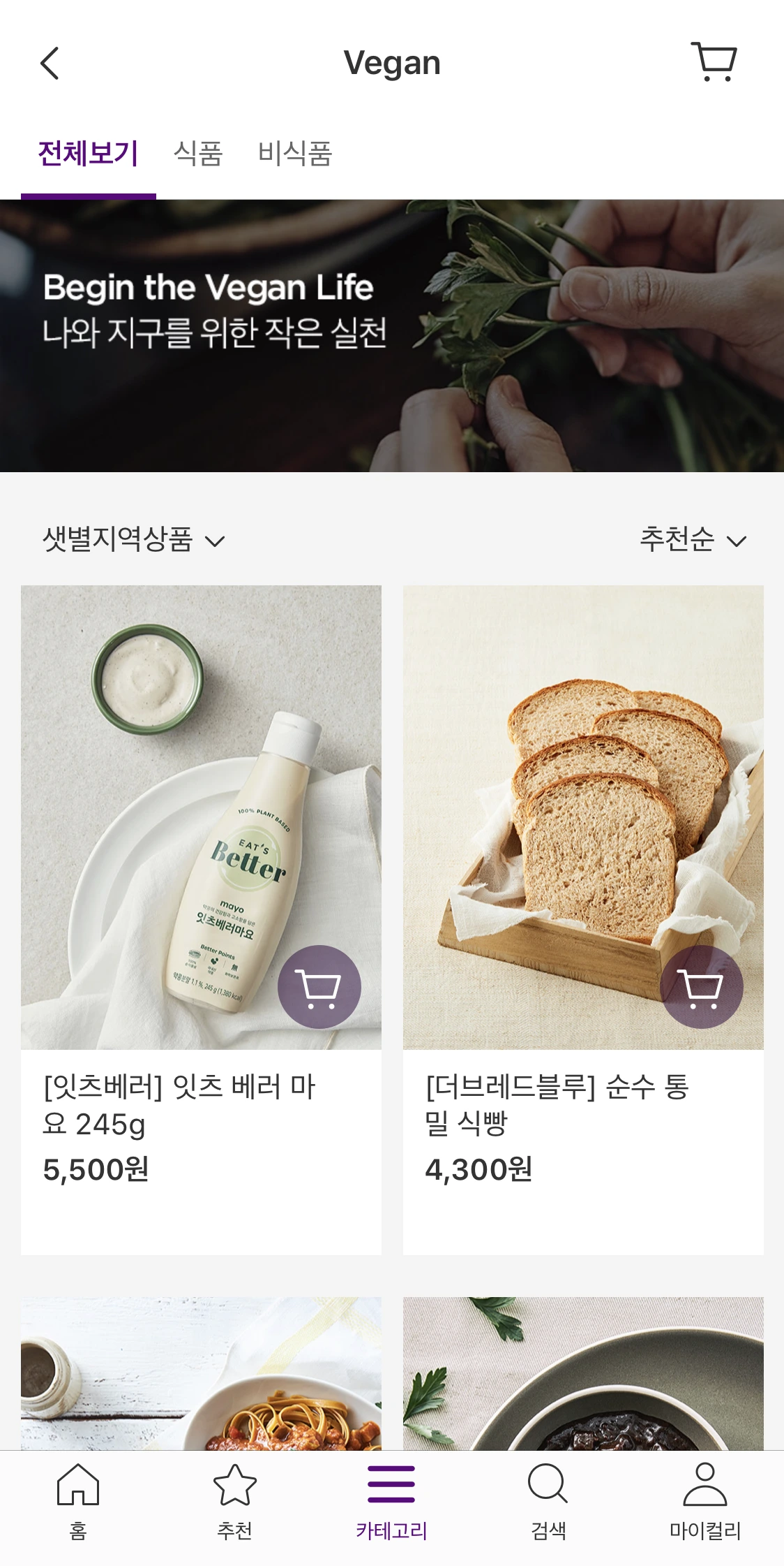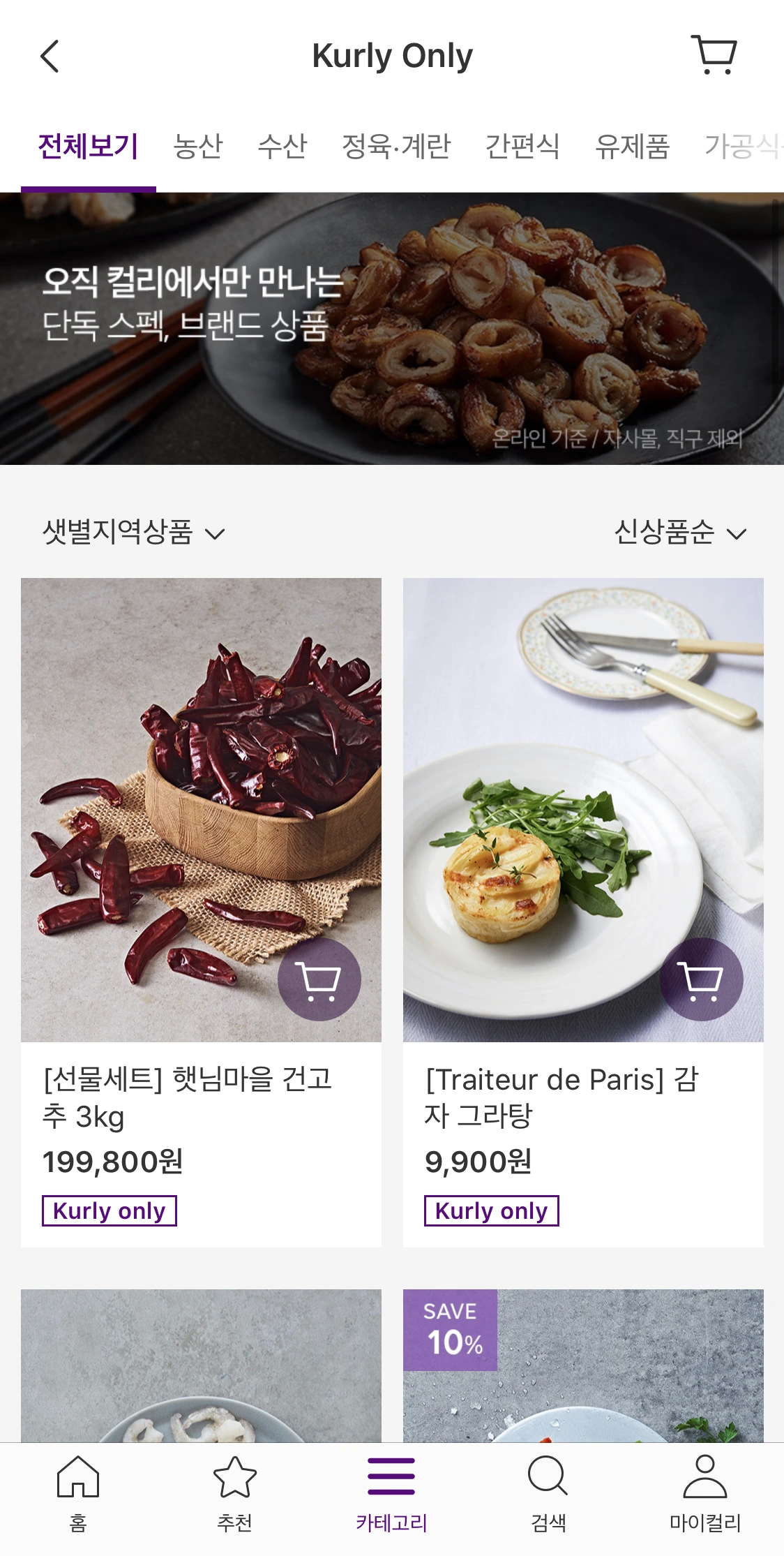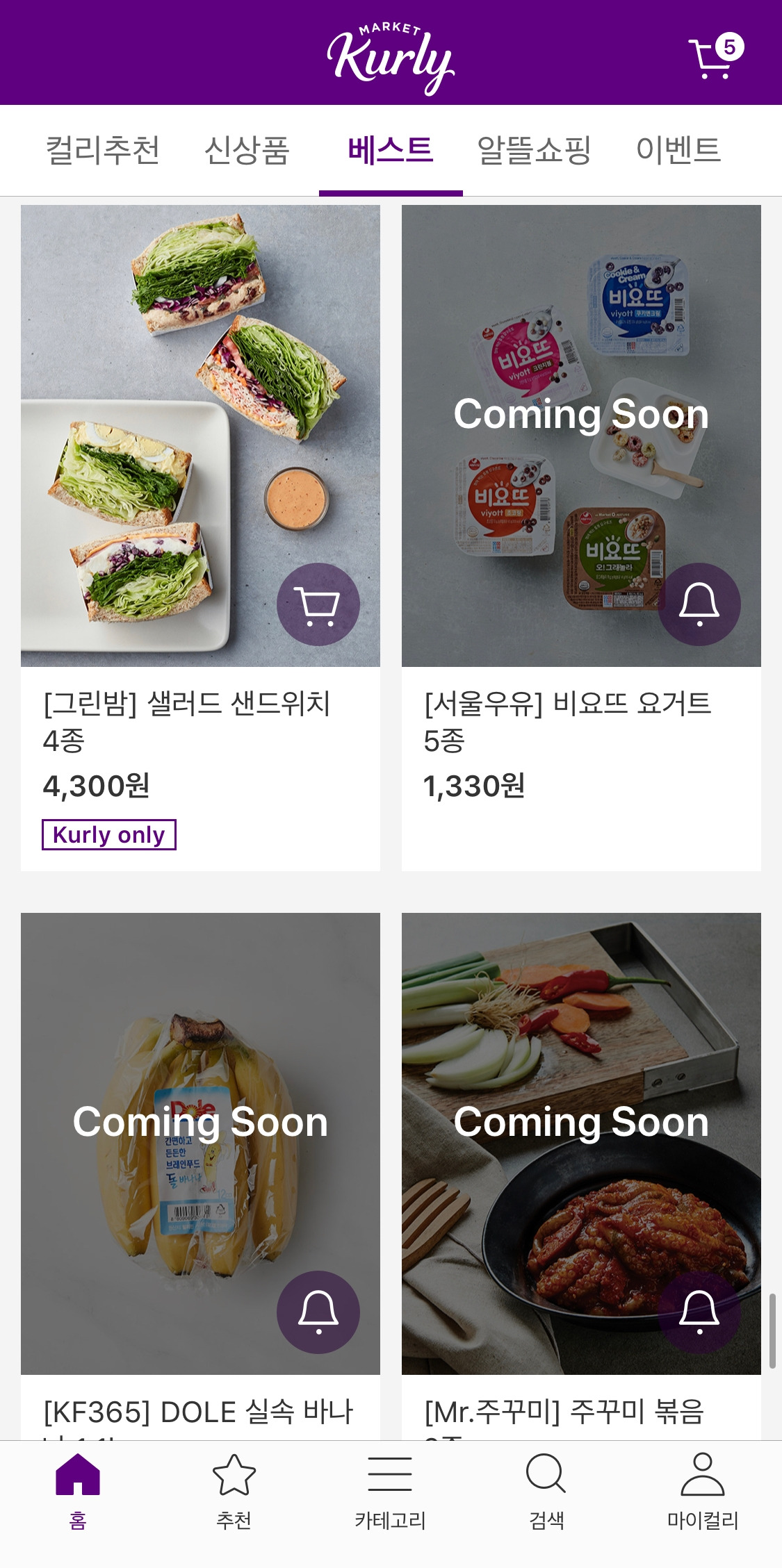 마켓컬리의 하단 추천 탭에서는 말 그대로 제품의 추천 기능을 사용할 수 있다. 내 경우, 주로 두어 개만 더 담으면 무료 배송이 될 것 같은데 뭘 더 담지? 할 때 [추천]탭을 구경한다. 대부분 잘 팔리는 베스트 제품이거나 할인율이 높은 제품들인데 고객이 직접 남긴 후기와 함께 추천되어 보는 재미가 쏠쏠하다. 요즘 유저들은 사진도 정말 잘 찍어서 후기가 무슨 음식 잡지 속 기사 수준인데(..) 신뢰도 높은 제품 후기를 통해 미처 알지 못했던 레시피까지 공유받으며 살 생각이 없던 제품도 장바구니에 담게 만드는 마성의 추천 기능. (컬리 후기를 읽으면서 자주 느끼는 거지만 요즘의 고객들은 냉정하다. 맛이 없으면 없다고 한다. 경험상, 후기를 읽고 재구매 의사가 많은 제품인지를 먼저 확인하는 것이 가장 정확한 방법.)
